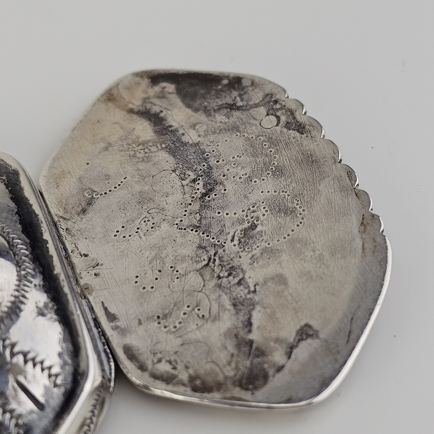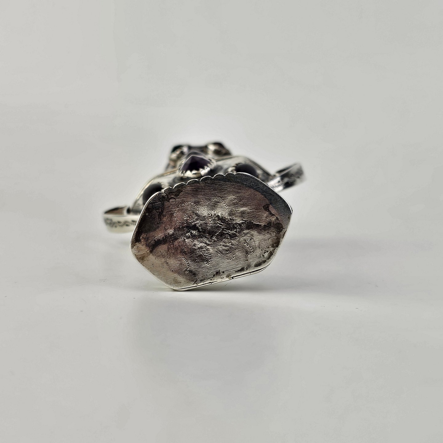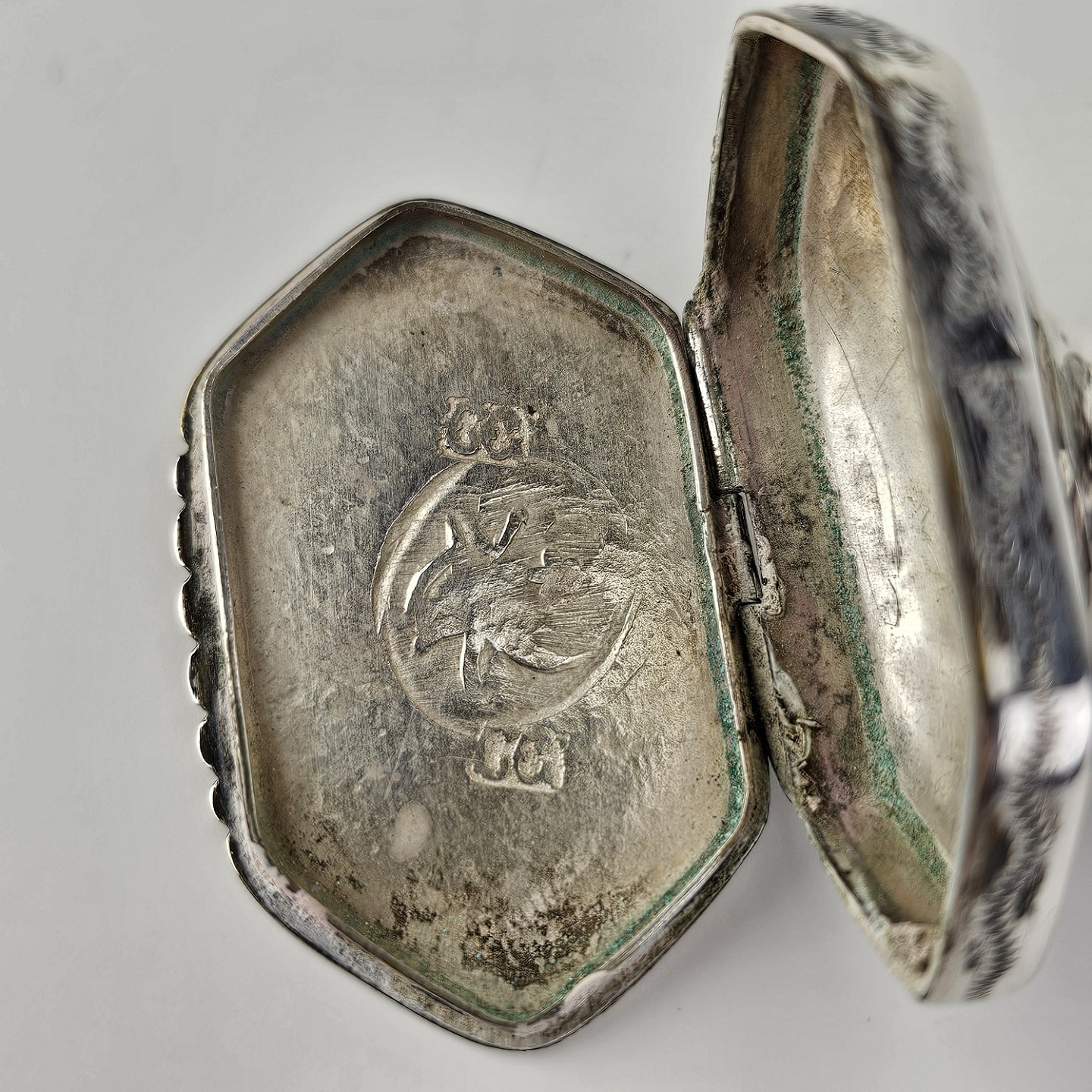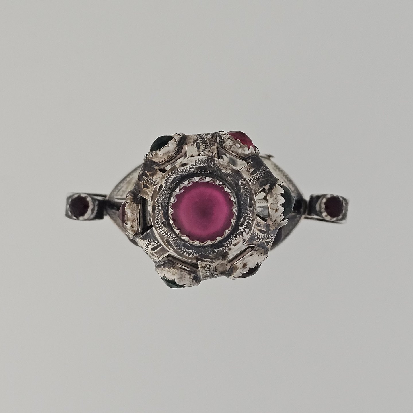 Hovedvandsæg i sølv dekoreret med forskellige smykkesten. Indgraveret under bunden med et hjerte, initialer og årstallet 1955Producent ukendt, stemplet muligvis CG