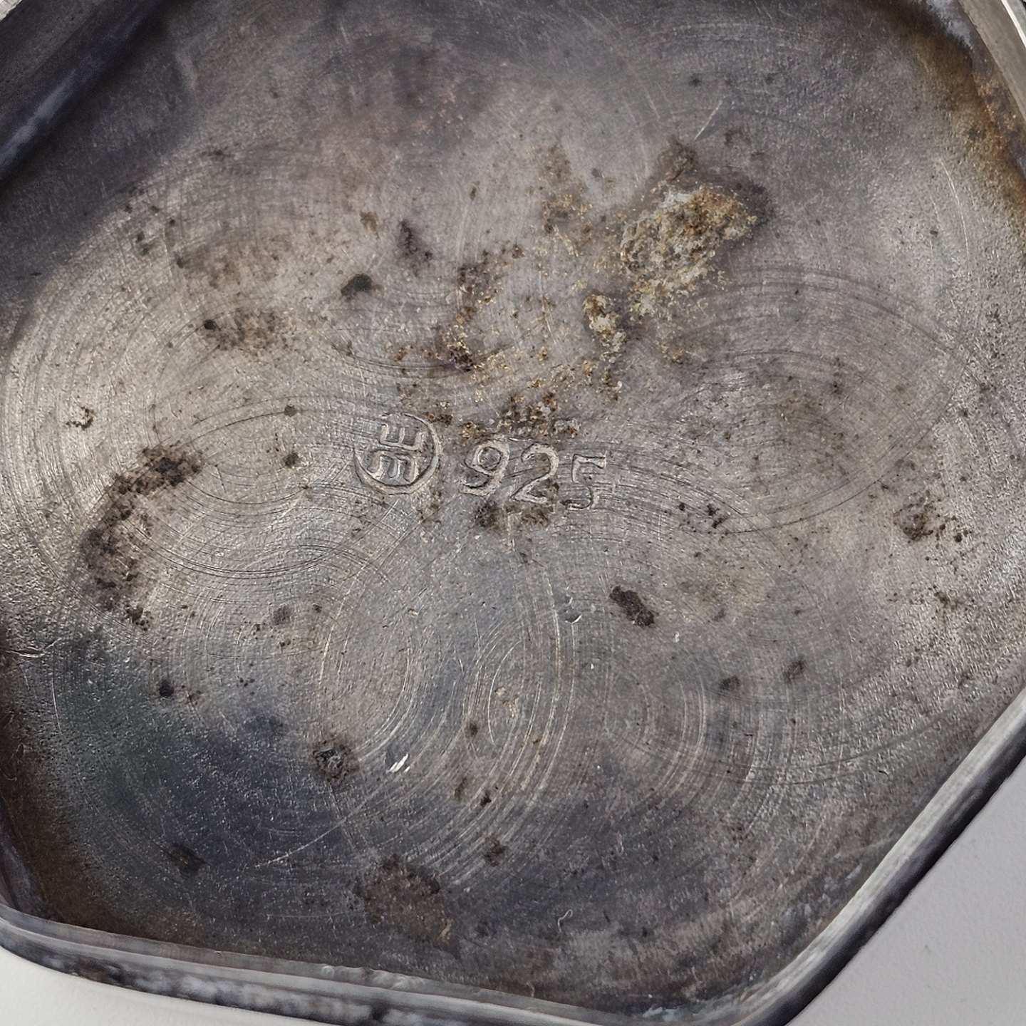 Sekskantet pilleæske i sterling sølv med indgraveret bladmotiv Stemplet 925