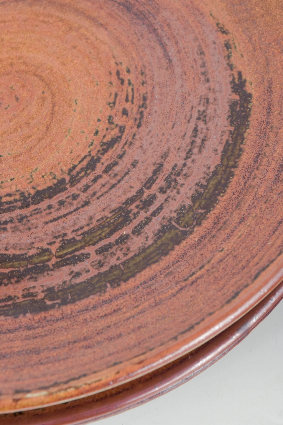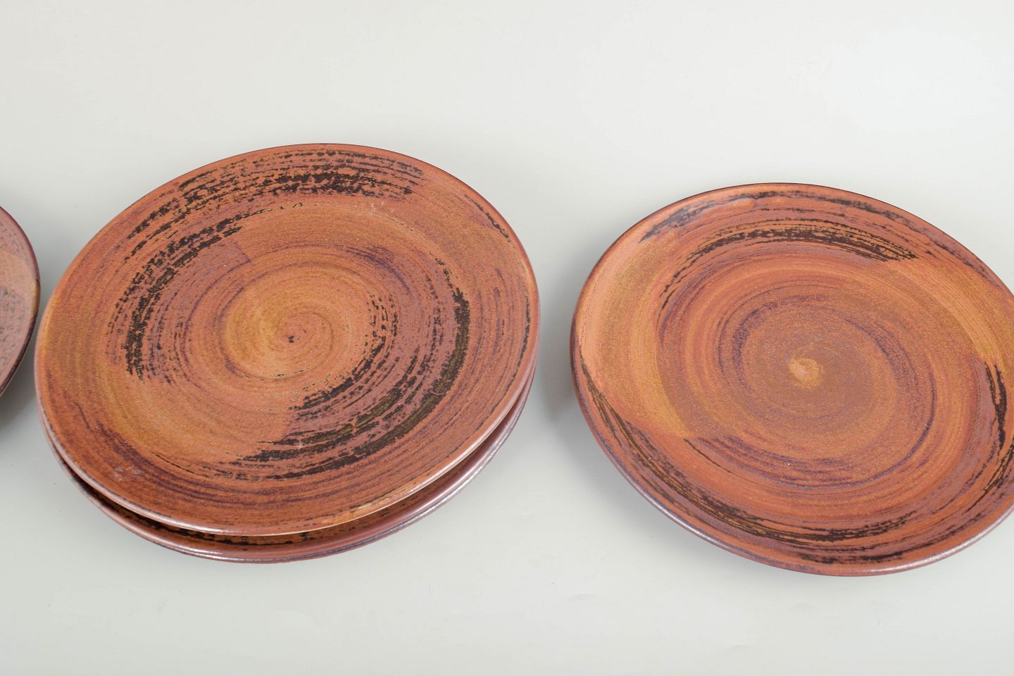 Carl-Harry Stålhane for Designhuset, set of five dinner plates.Wheel-thrown stoneware dinner plates with a warm brown and copper-toned glaze in a circular turned pattern, each plate showing slight individual variation.
