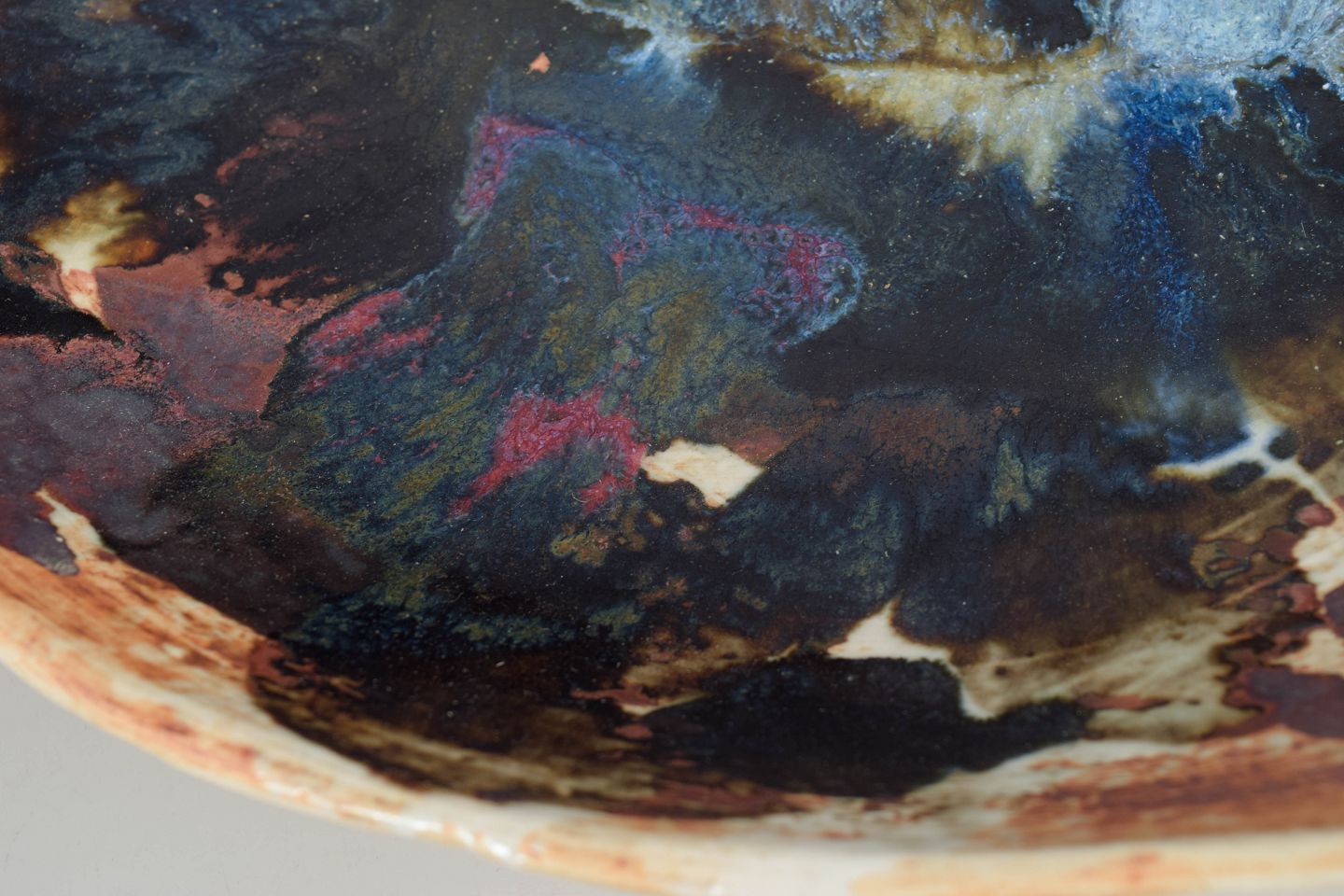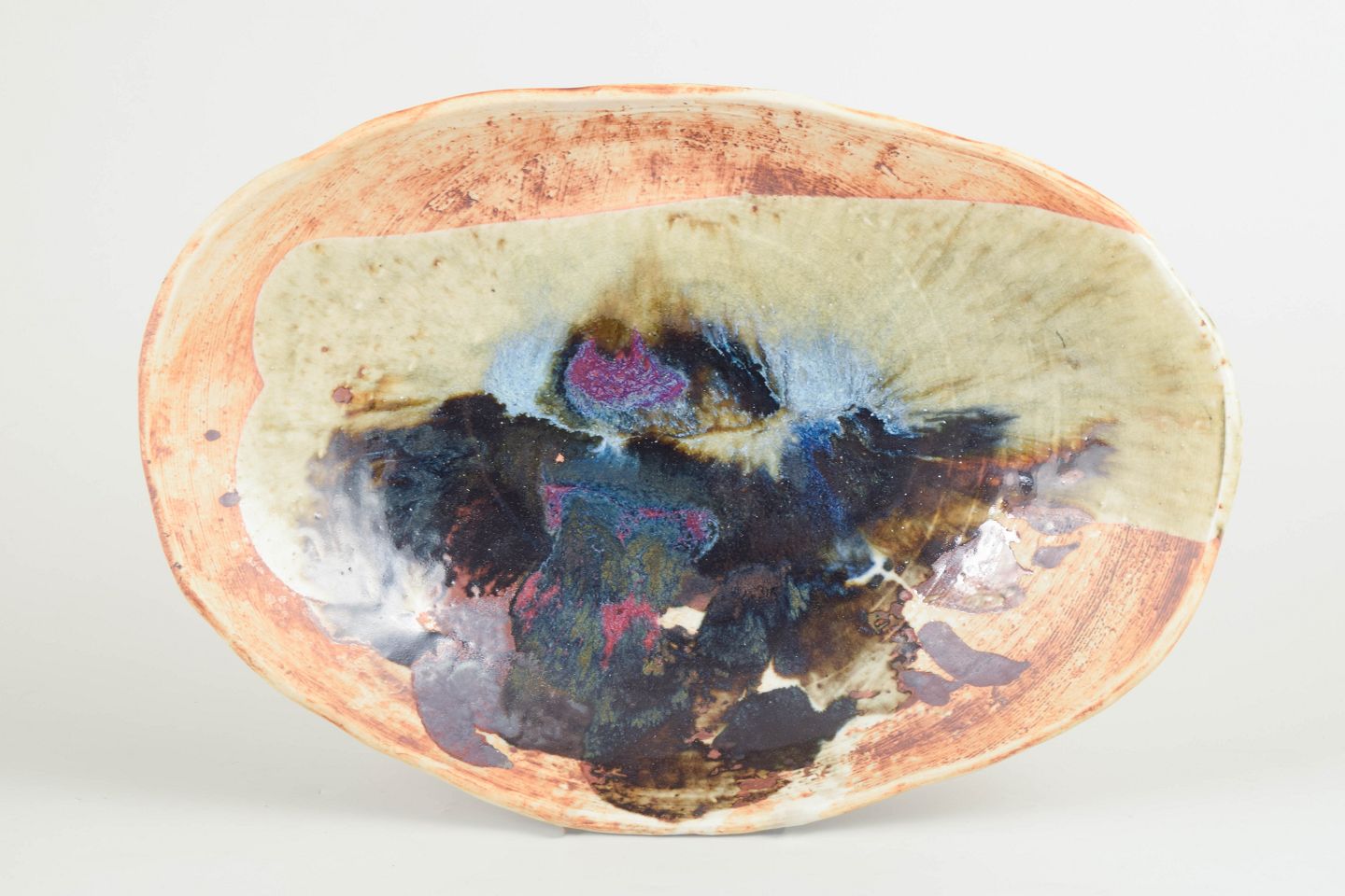 Unique, organically shaped bowl in thrown stoneware with an expressive abstract decoration and multicoloured glaze in earthy and bluish tones.