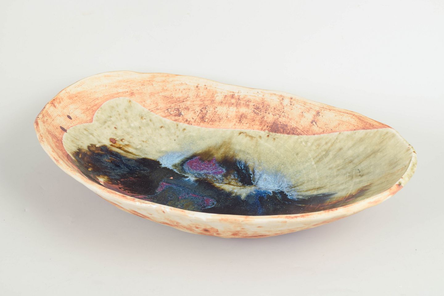 Conny Walther, large bowl.Unique, organically shaped bowl in thrown stoneware with an expressive abstract decoration and multicoloured glaze in earthy and bluish tones.