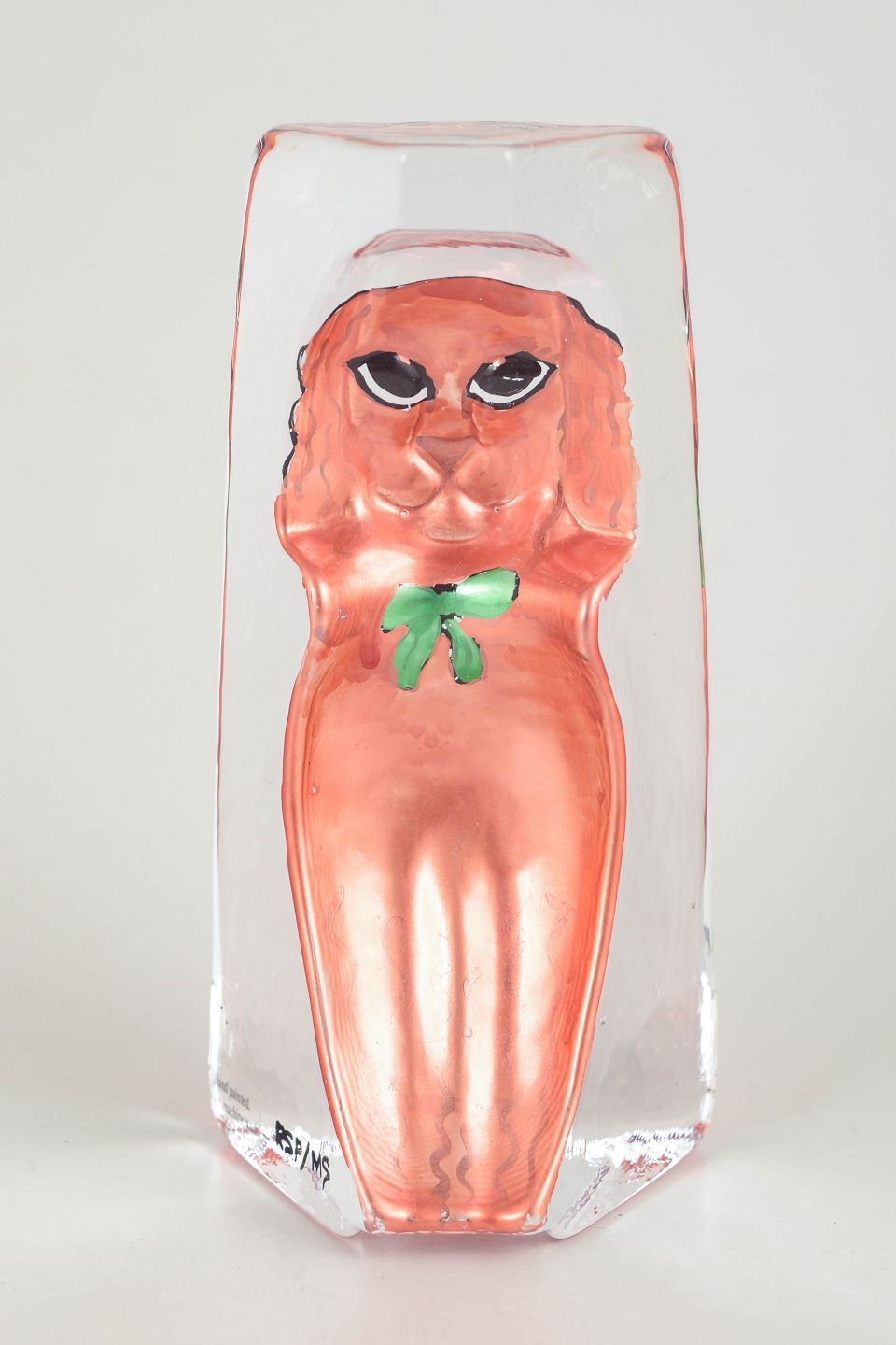 Both Kosta Boda and Sea Glasbruk were known in the 1980s for Swedish art glass with strong colours and playful, figurative motifs. Production often featured mouth-blown forms with encased figures and hand-painted graphic details, giving the works a distinctive and recognisable character. Such pieces combine studio glass tradition with decorative design and are today sought after by collectors.