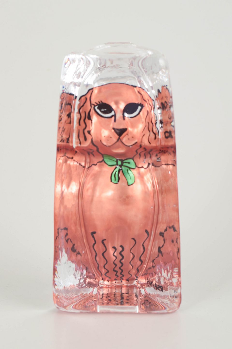 Renate Stock-Paulsson for Kosta Boda / Sea Glasbruk, dog figure.Mouth-blown glass figure in clear glass with an encased pink dog motif, hand-painted details, and the model formed in relief inside the glass.