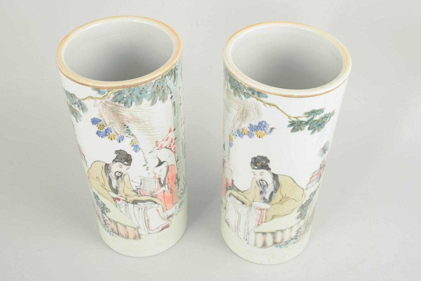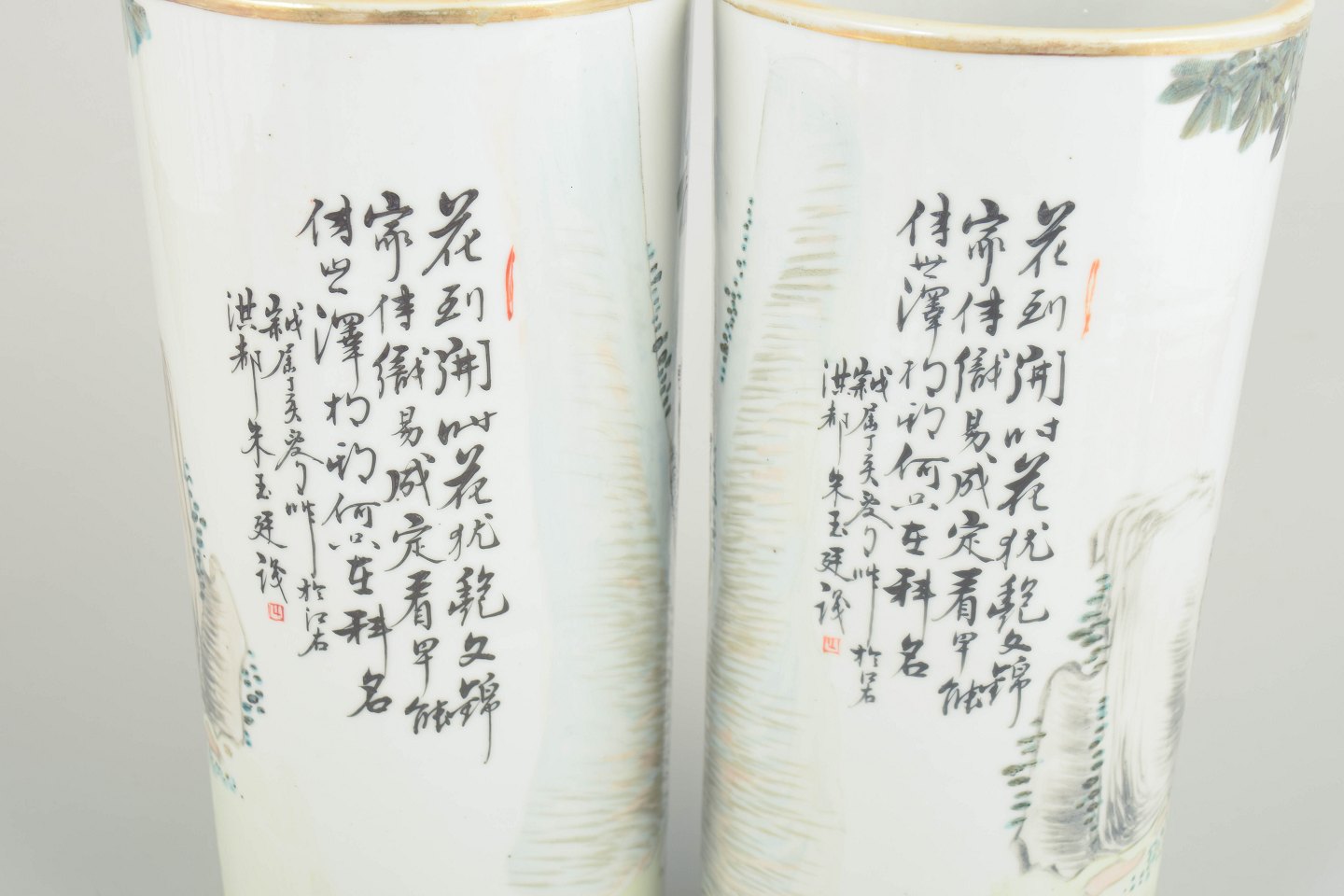 Chinese Porcelain, Pair of Hat Stands.Pair of cylindrical porcelain hat stands, hand-decorated with figural scenes in enamels together with calligraphy and seals. The calligraphic text may be translated as: “The fragrance of flowers is pure and far-reaching; the graceful blossoms reflect refined taste and express calm, harmony, and unity between nature and man.”