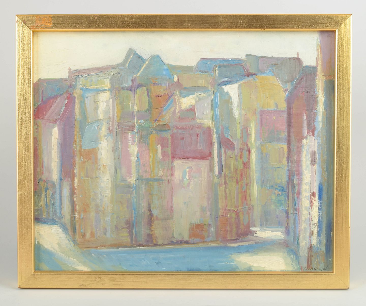 Villy Stenstrup Jensen (b. 1919-1995), painting, listed Danish artist.Modernist cityscape executed in oil with simplified architectural forms and a restrained colour palette, signed lower right.