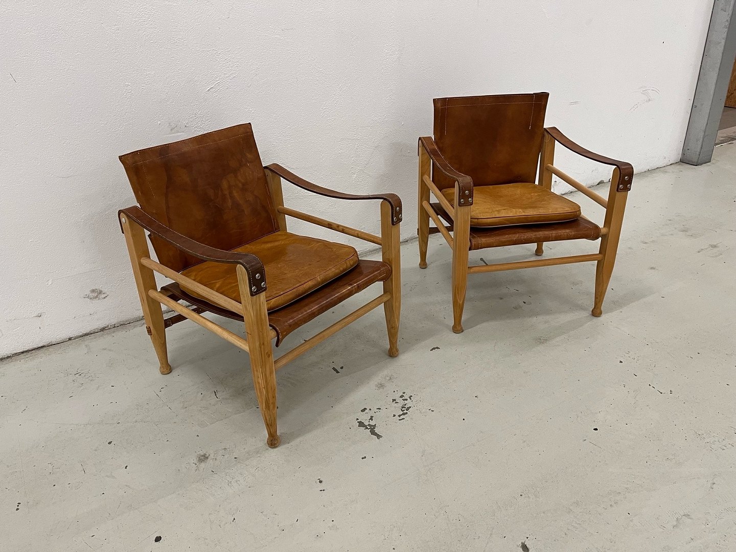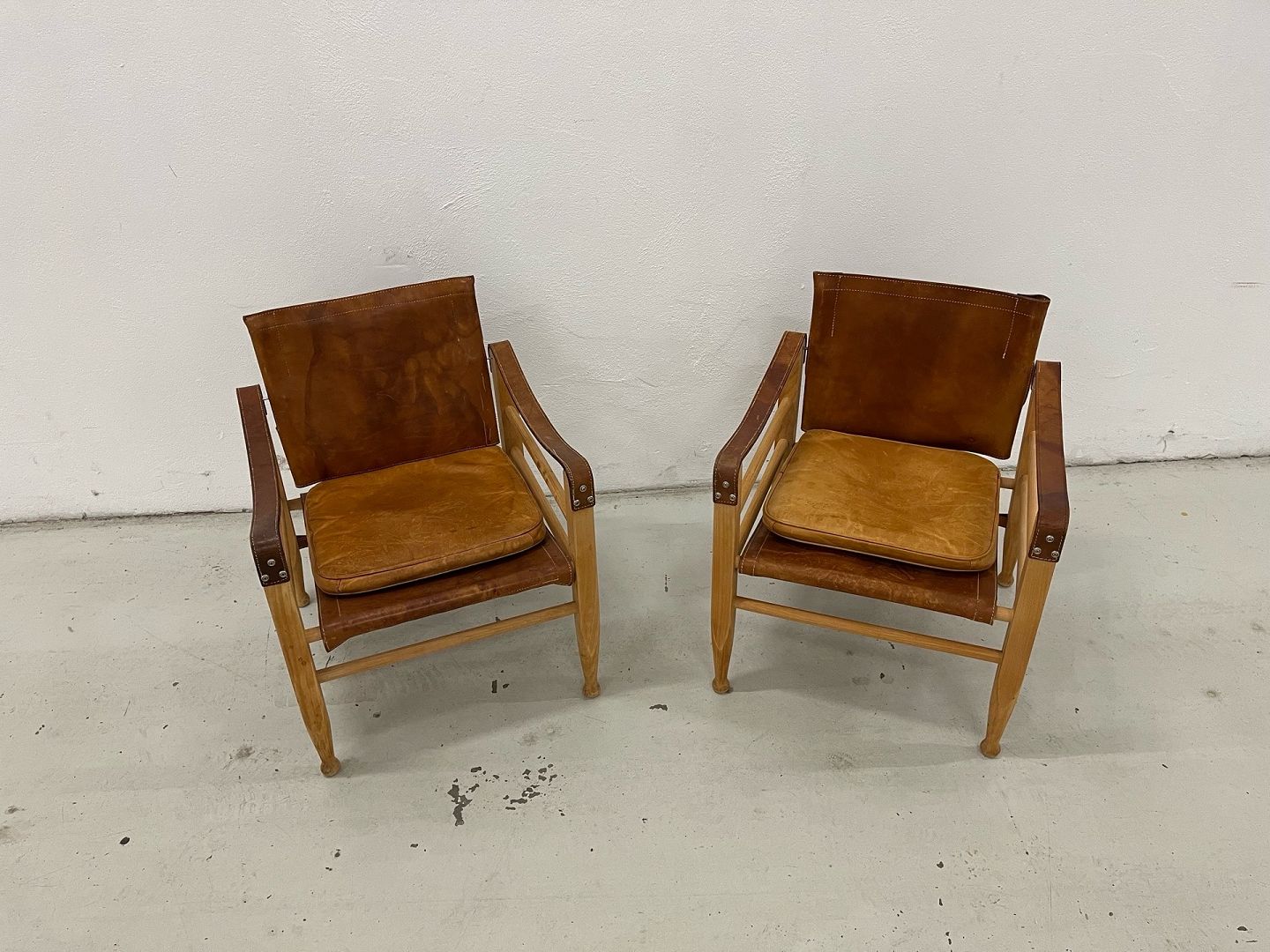 Aage Bruun & Søn - Safari chairs, 1960sA completely unique and exceptionally well-preserved set of safari chairs designed by Aage Bruun & Søn from the 1960s. The chairs are made with a solid beech frame and seat, back and armrests in cognac-colored, patinated grain leather. The leather appears beautifully patinated, and both buckles, straps and frames are in completely original and flawless condition. The chairs have had one owner since new and come from a smoke- and pet-free home. The set comes complete with original leather sofa and cushion.Dimensions:Height: 67 cm � Width: 55 cm � Depth: 57 cm � Seat height: 36 cm