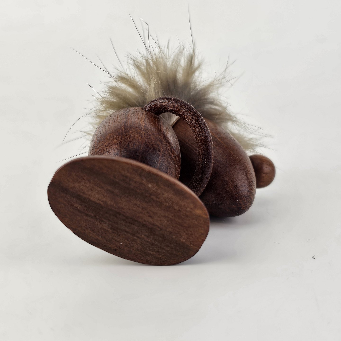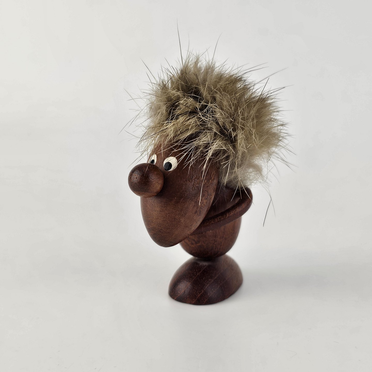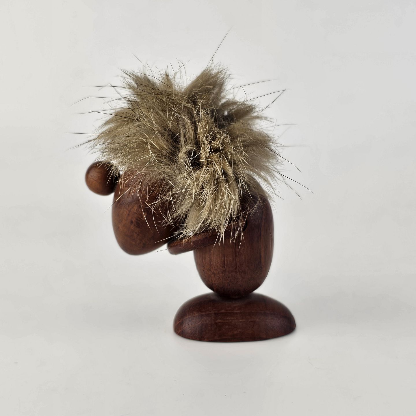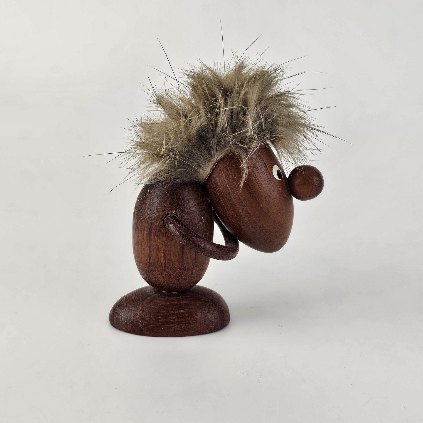 Håndskåret figur af teak med støvet blond hår og arme af læder. Fra 1960'erneDesign Hans Bølling