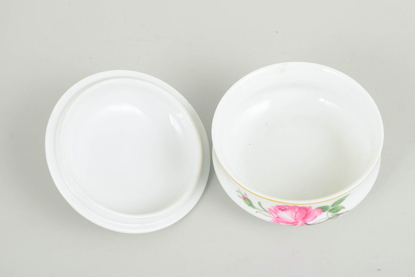 Meissen, lidded bowl.Round lidded bowl in white porcelain decorated with a hand-painted polychrome rose and small floral motifs, accented with subtle gilt detailing to the rim and foot. The finial is formed as a knop. Marked to the base with the Meissen crossed swords.