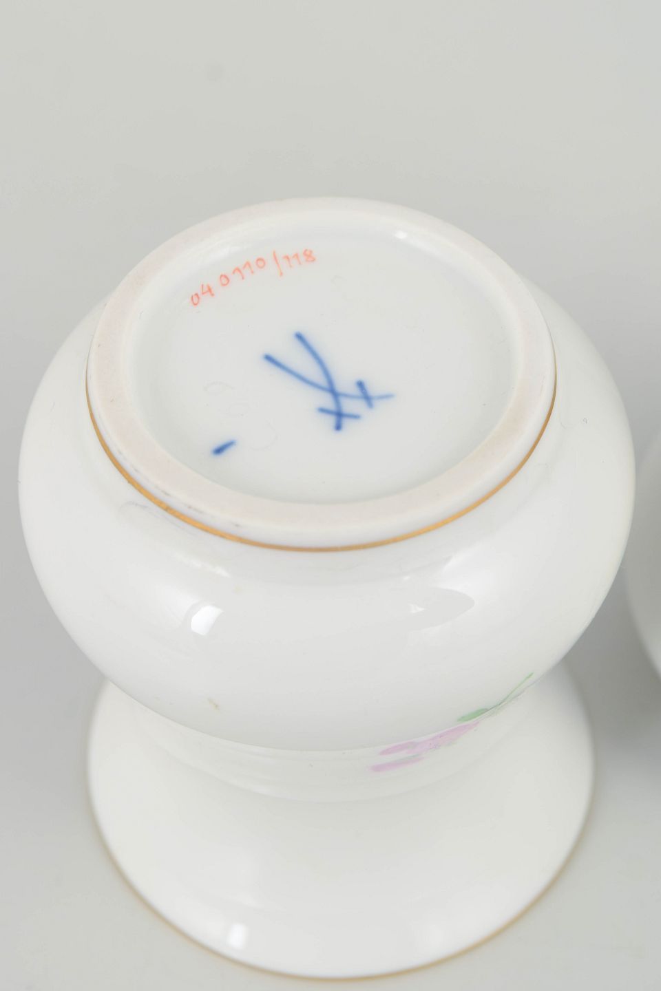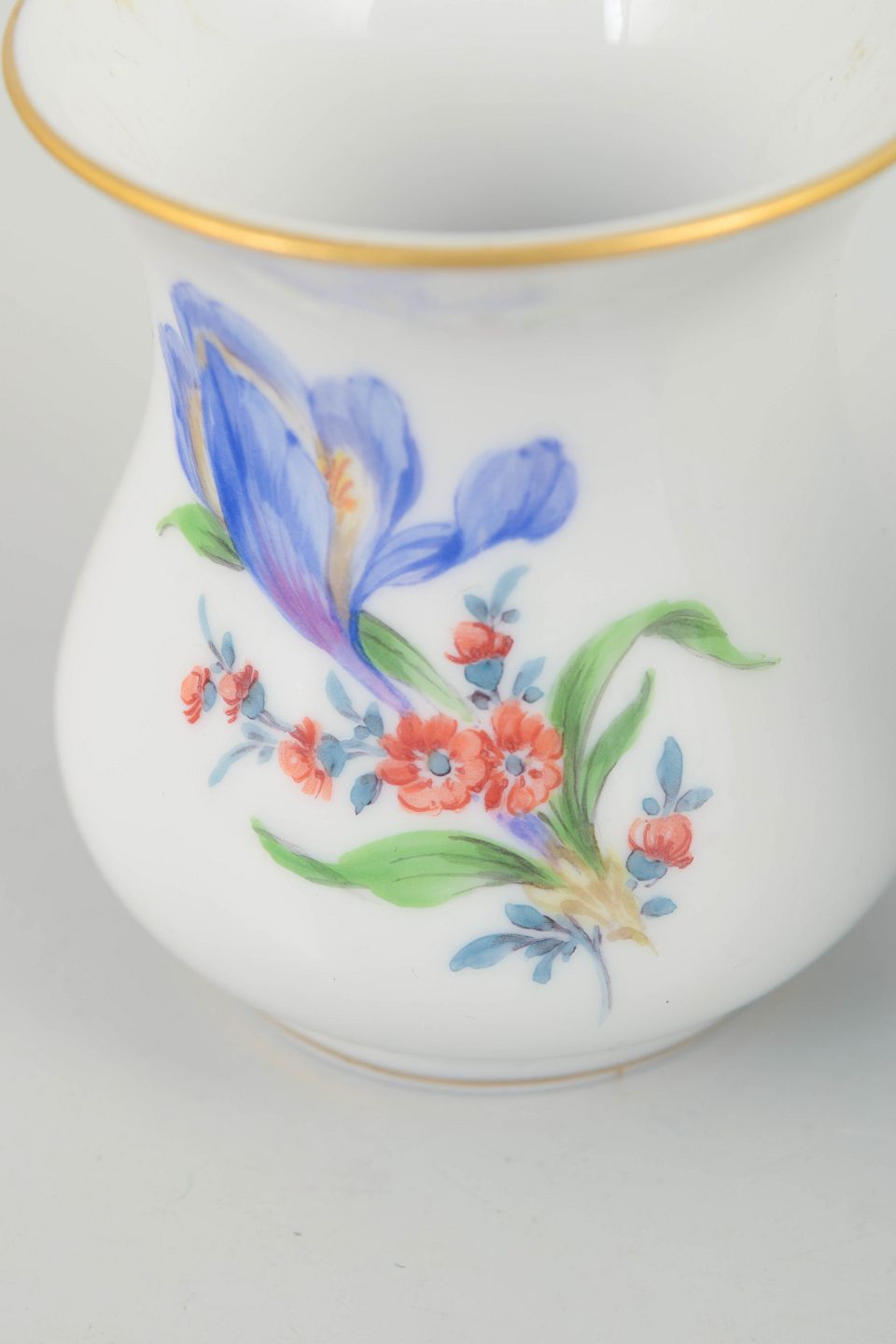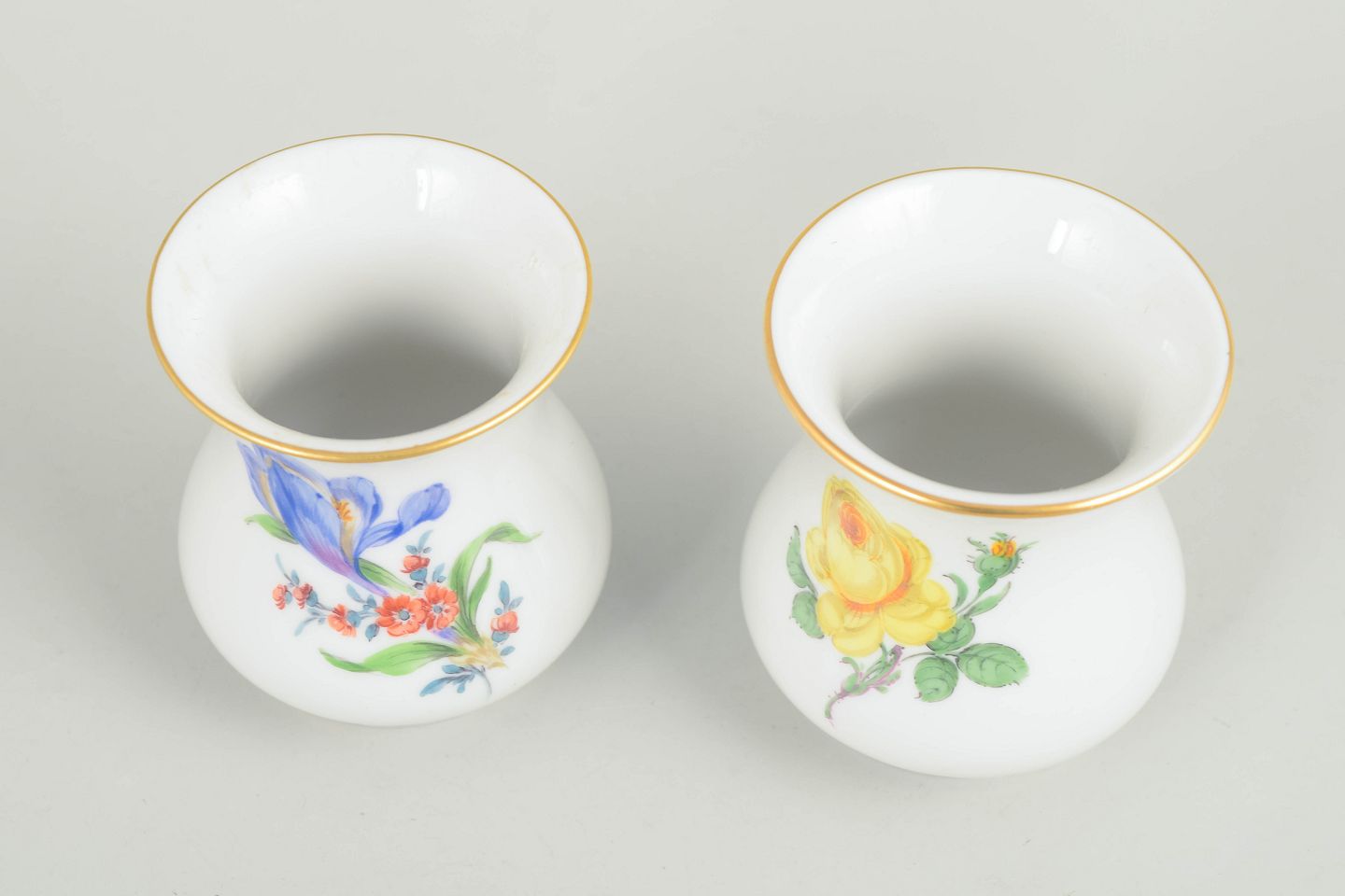 Meissen, miniature vases, pair.Small baluster-shaped miniature vases in white porcelain, decorated with hand-painted polychrome floral bouquets and finished with a gilt rim. Marked to the base with the Meissen crossed swords.