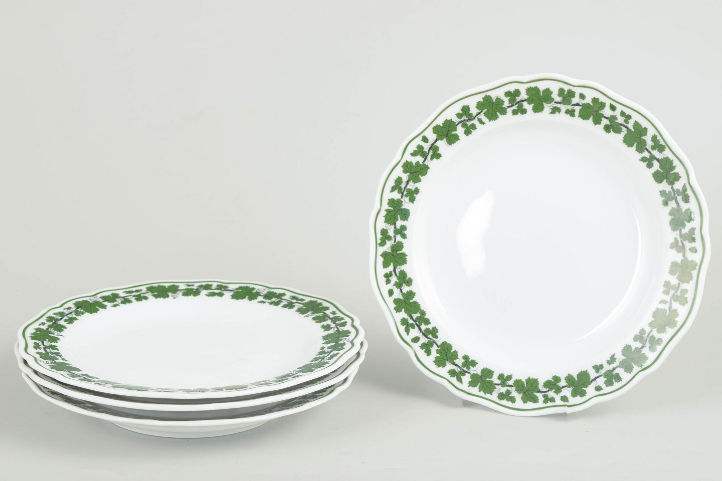 Meissen, Vine Leaves, set of 4 salad plates.Round porcelain plates decorated with a green vine leaf border. Some examples are first quality, others cancelled with four incised lines. Marked with the Meissen crossed swords.