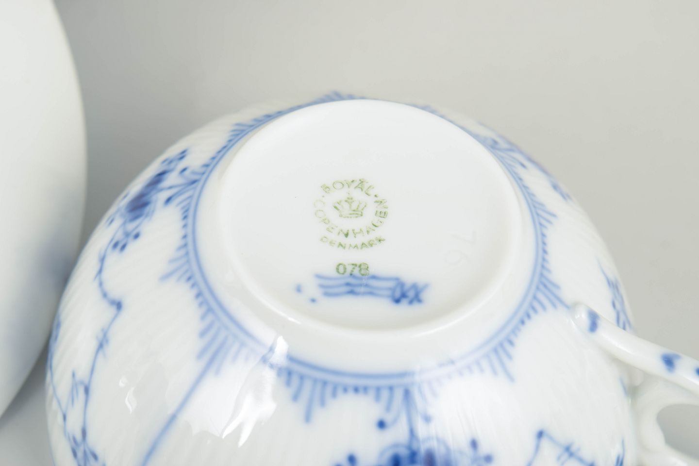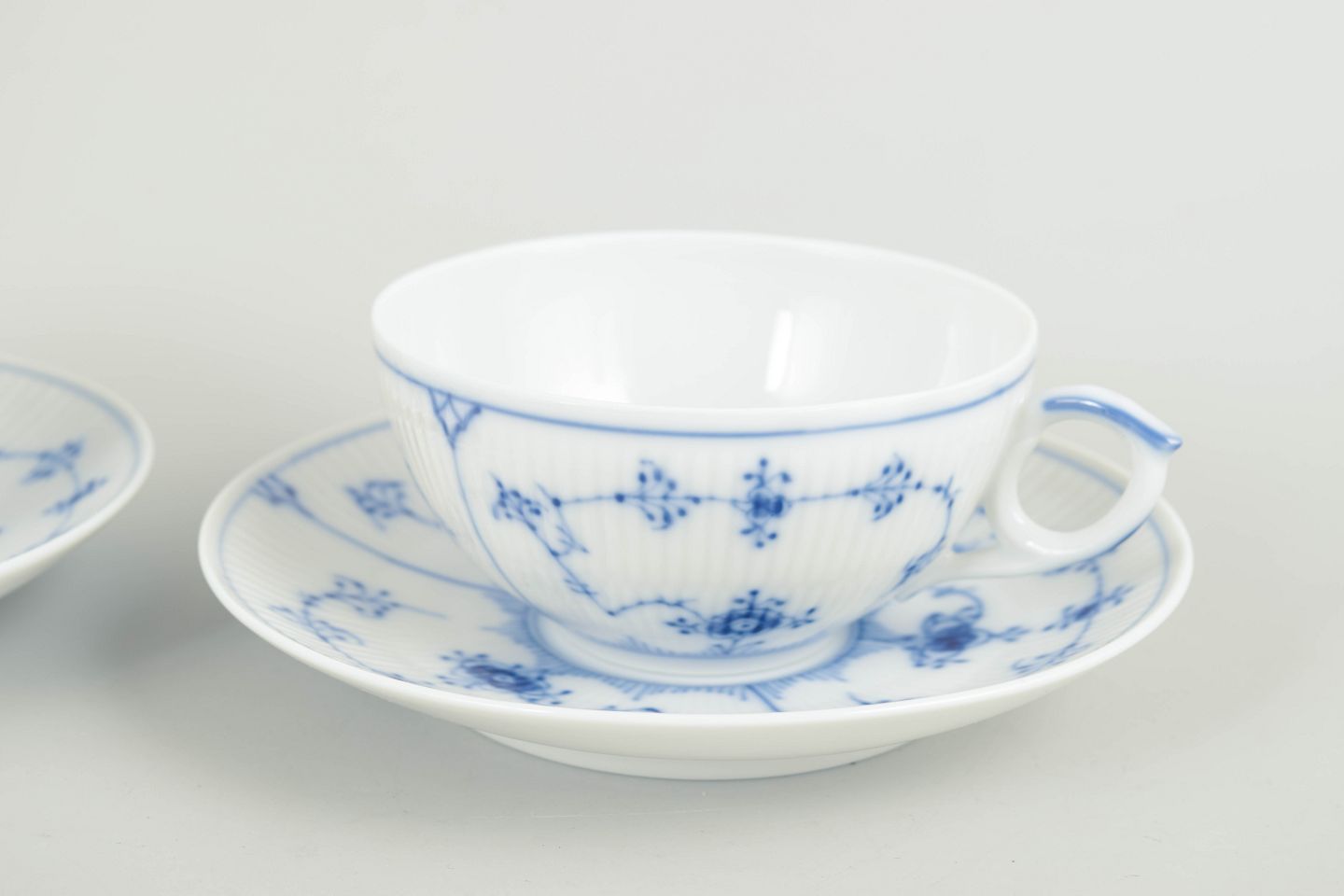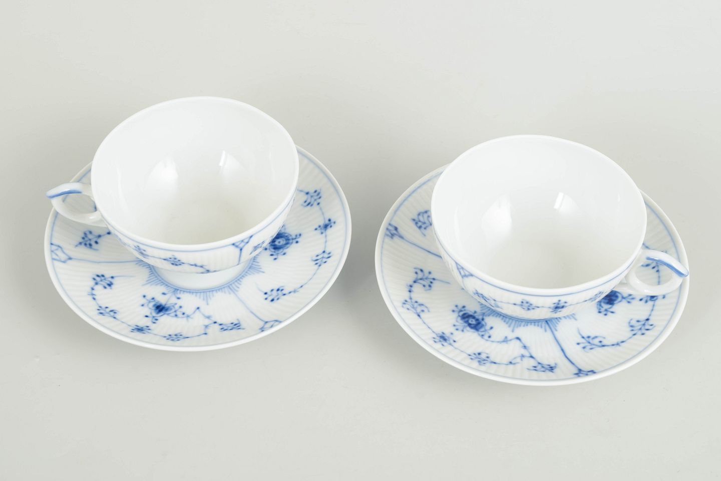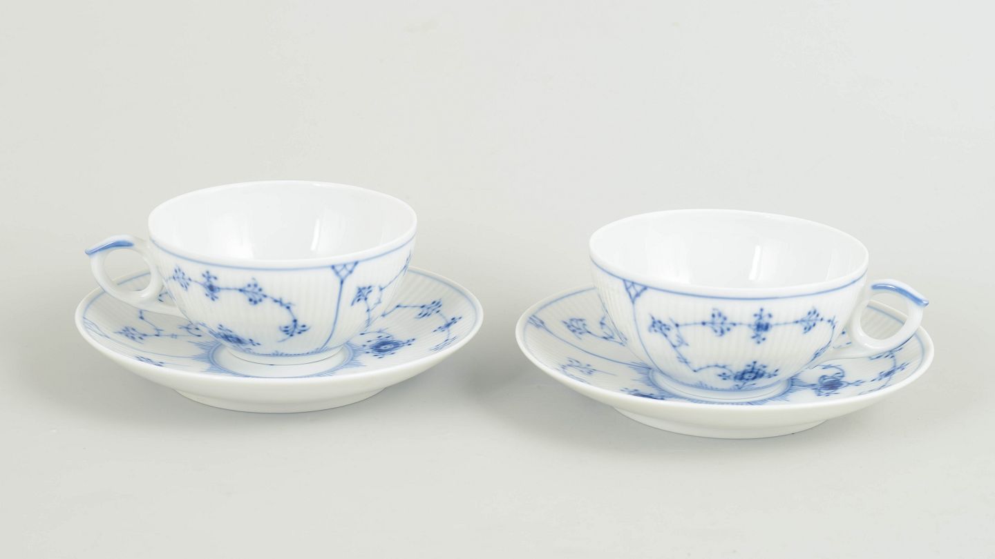 Royal Copenhagen, Blue Fluted Plain tea cups with saucers, set of 2.Two tea cups with matching saucers in hand-painted underglaze cobalt blue decoration in the classic Blue Fluted Plain pattern. Cups model 078, saucers model 082. Cancelled with one incised line.
