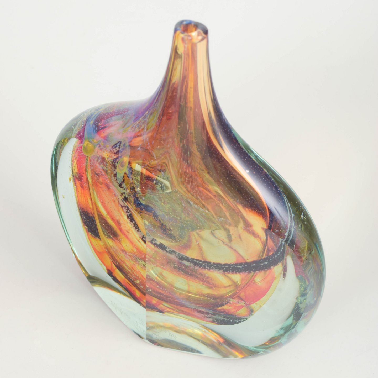 Mdina Glass, art glass vase.Organically shaped art glass vase in heavy, hand-blown glass with encapsulated swirling colours in amber, orange, and dark contrasting tones, finished with a clear outer layer. Freely formed asymmetric profile with pronounced weight in the base. Signed to the underside “Mdina glass, Malta”.