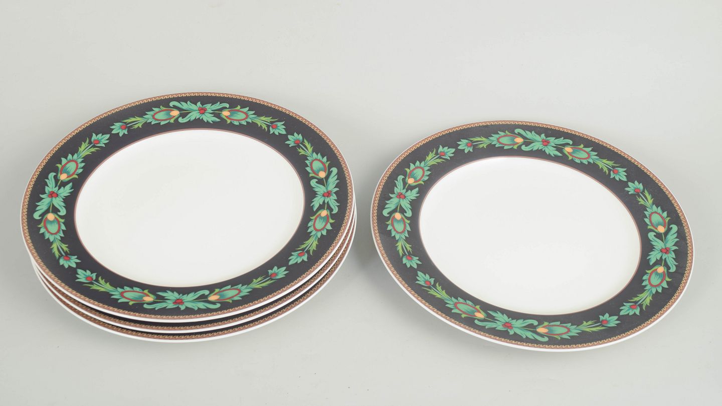 Nina Campbell for Rosenthal, set of 4 dinner plates.Set of four flat porcelain plates by Rosenthal Classic from the Mayfair series, decorated with a dark border, stylised green foliate motifs and gilt detailing, produced in the 1980s.