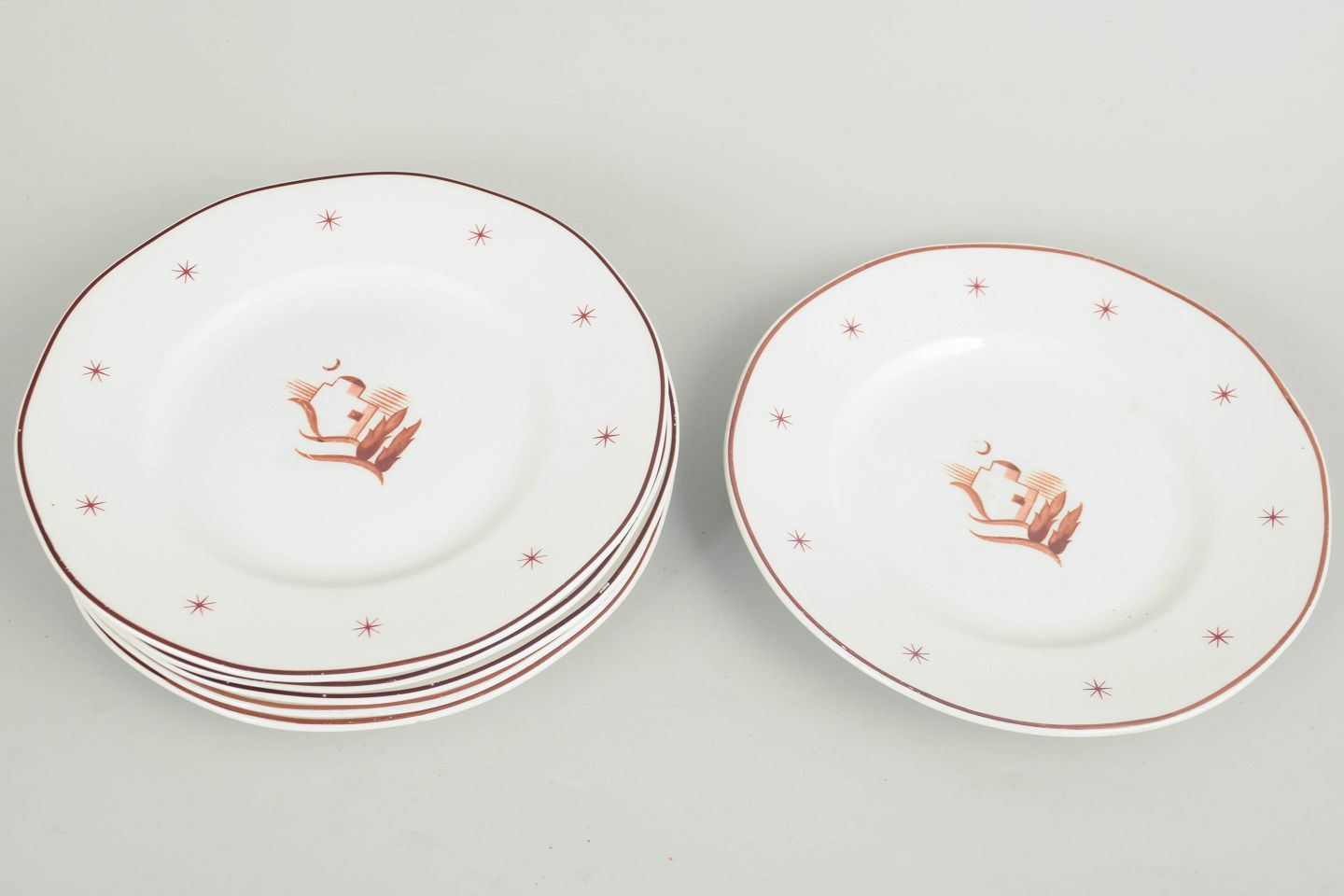 Arabia, Orient, set of 6 small lunch plates.Small plates in glazed earthenware with a scalloped rim, brown border line and star motifs, featuring a central oriental landscape motif. Orient model.
