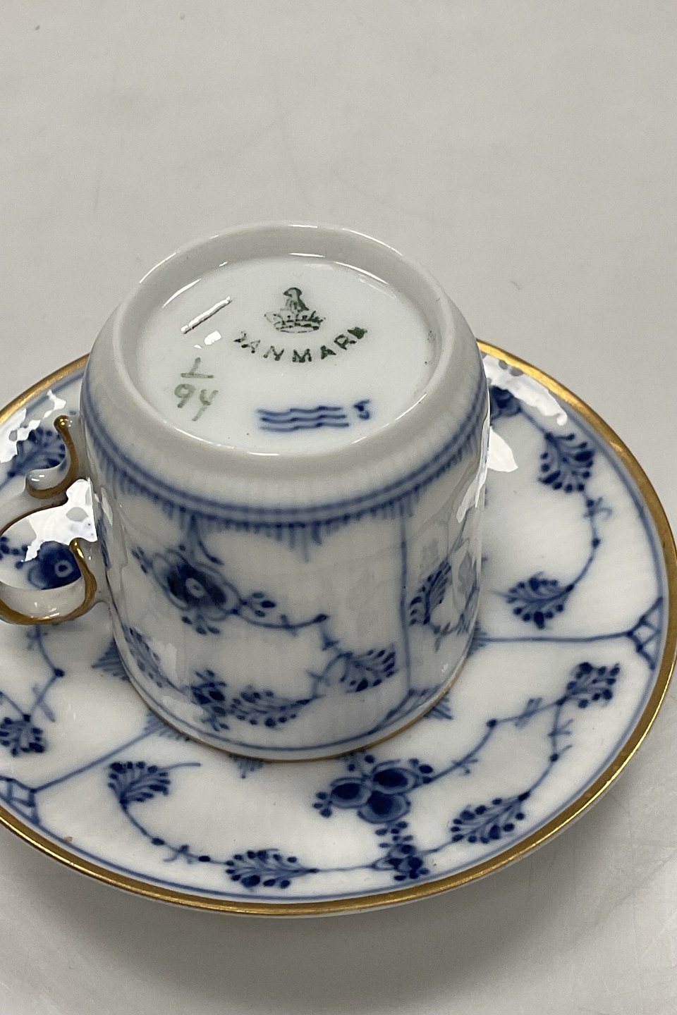 Royal Copenhagen Blue Fluted Plain with gold Mokka Cup No. 94Measures 4,3cm x 4,5cm and saucer 9cm / 1.69 inch x 1.77 inch and 3.54 inch