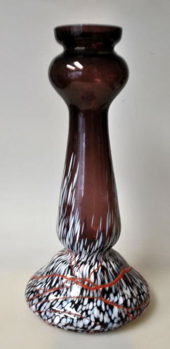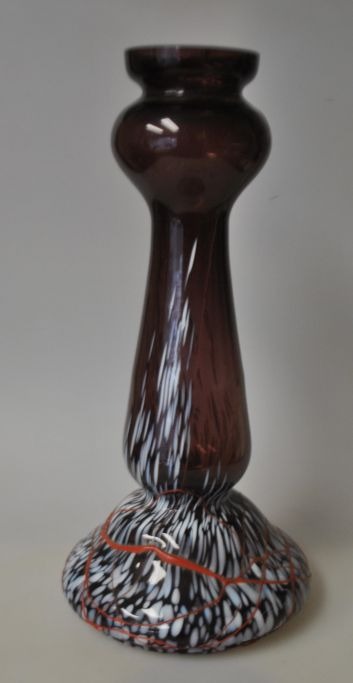 Jugend vase, ca. 1900, Germany. Violet glass with a base of white, blue and grey glass. Red glass line above. H.: 29.5 cm.Exciting piece!