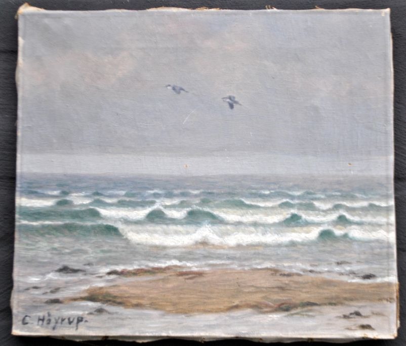 Høyrup, Carl (1893 - 1961) Denmark: Two herons. Beach at Kerteminde, 1924. Oil on canvas. Signed: C. Höyrup. H: 33 cm. W: 38 cm.