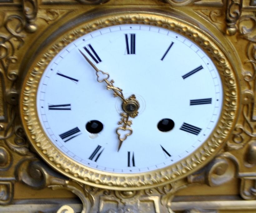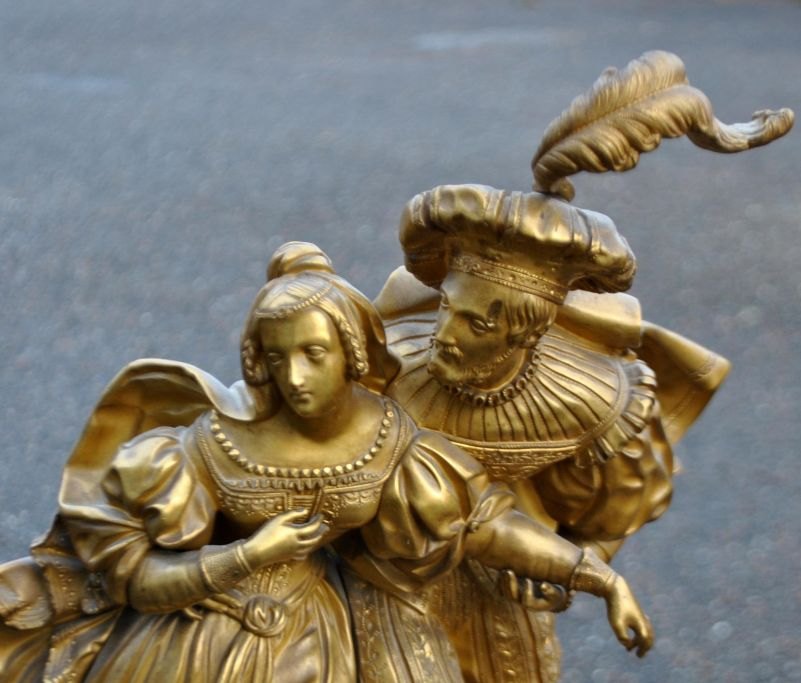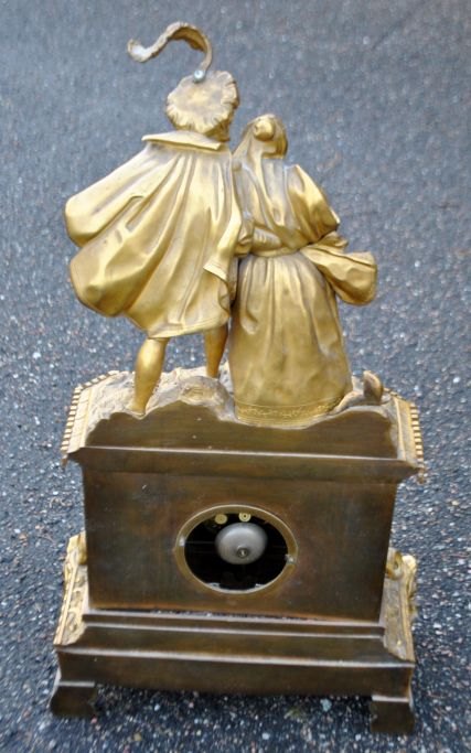 French mantel clock in gilt bronze, 1810 - 1820. Charles X. The clock is decorated with figures depicting a cavalier and a woman. Detailed case. With white enamel dial. H.: 70 cm. W.: 39 cm. D.: 14 cm.Item number: 28759