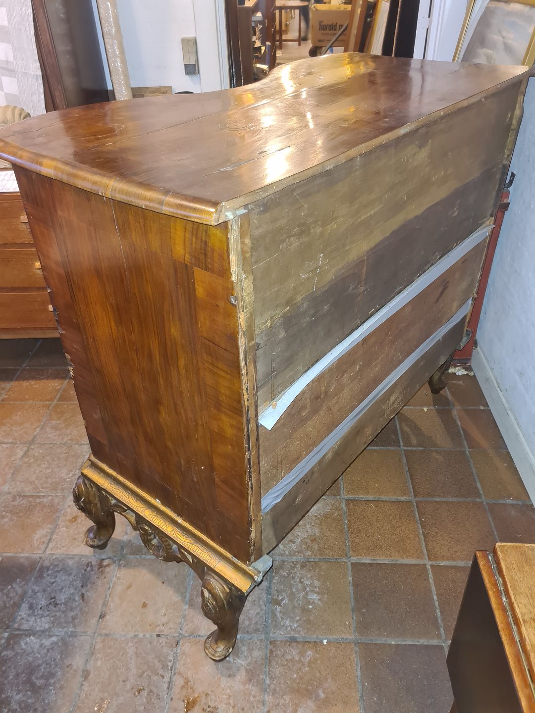 Rokoko dragkiste udført i delvis fineret mahogni og nøddetræ.