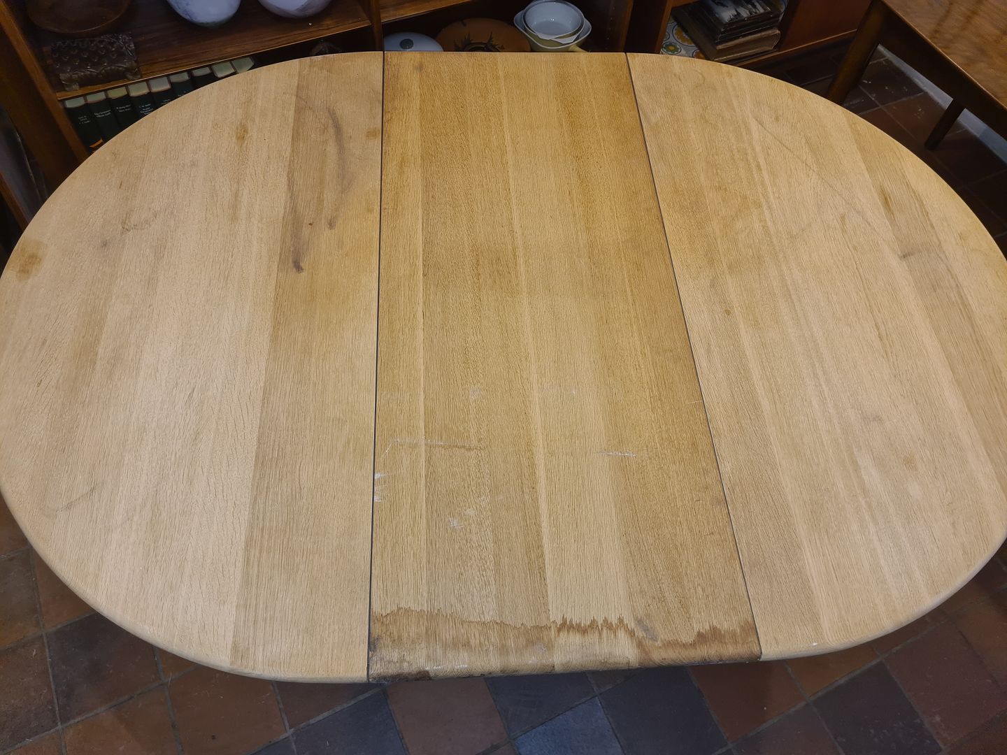 Kurt Østervig rundt spisebord udført i massiv eg samt 1 stk. tillægsplade også massiv eg. Fremstillet hos KP Møbler ca. 1980'erne. Mærket herfra.Brugt stand, fremstår med brugsspor, ridser og mærker. Samt tidligere fugtskade på tillægsplade. Se foto.