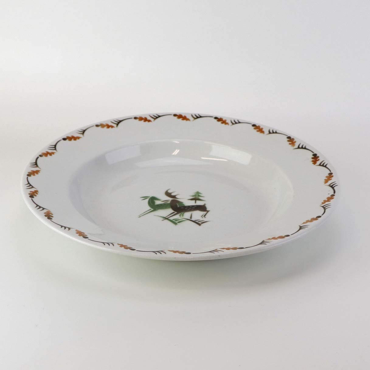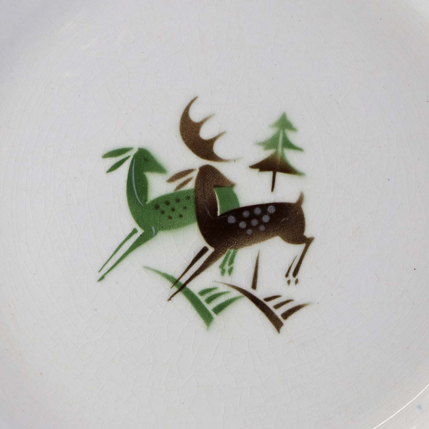Fajancestel i stelform C med dekoration af grøn og brun hjort på lys baggrund med kantbort af blade i brune nuancer.