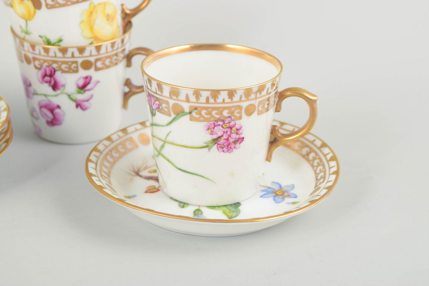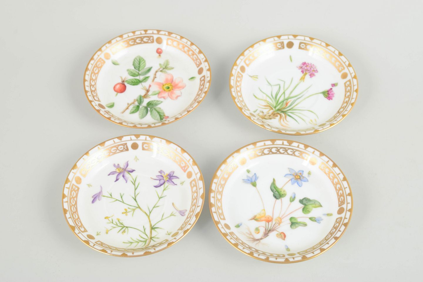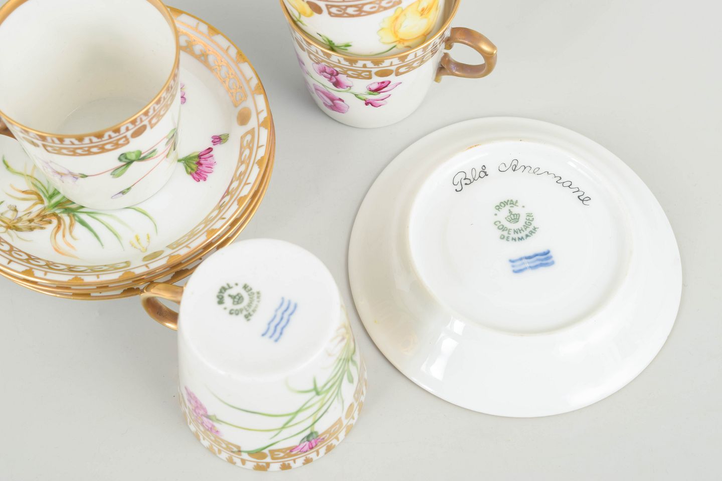 Royal Copenhagen, set of 4 demitasse cups with matching saucers.Porcelain in Flora Danica style with hand-painted botanical motifs and gilt rims.