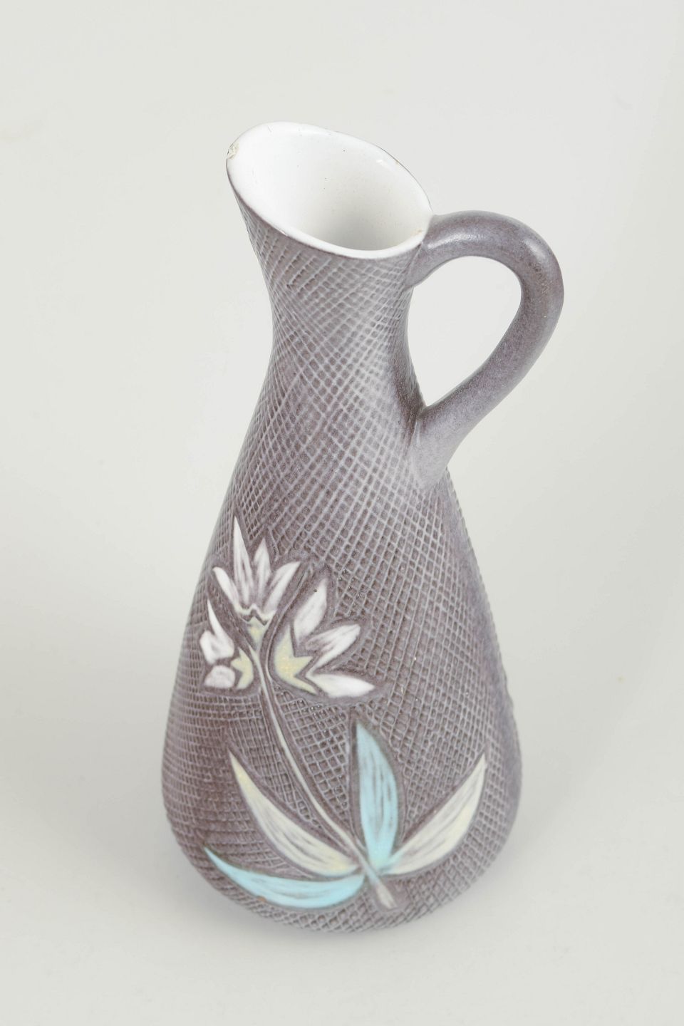 Mari Simmulson for Upsala Ekeby, pitcher.Elegant stoneware pitcher with a grey-violet finely textured surface and relief decoration featuring stylised leaves in light turquoise and white tones. Slender organic form with an integrated handle. The base is stamped and marked with model number 4499.
