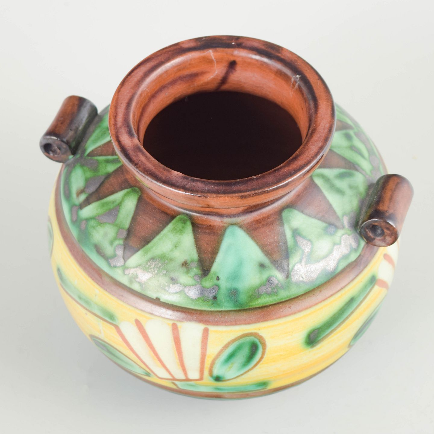Stoneware vase with polychrome glaze in green, yellow and brown tones, decorated with stylised leaf and plant motifs. The model features small side handles and is marked to the base with the factory stamp and model number 2750.
