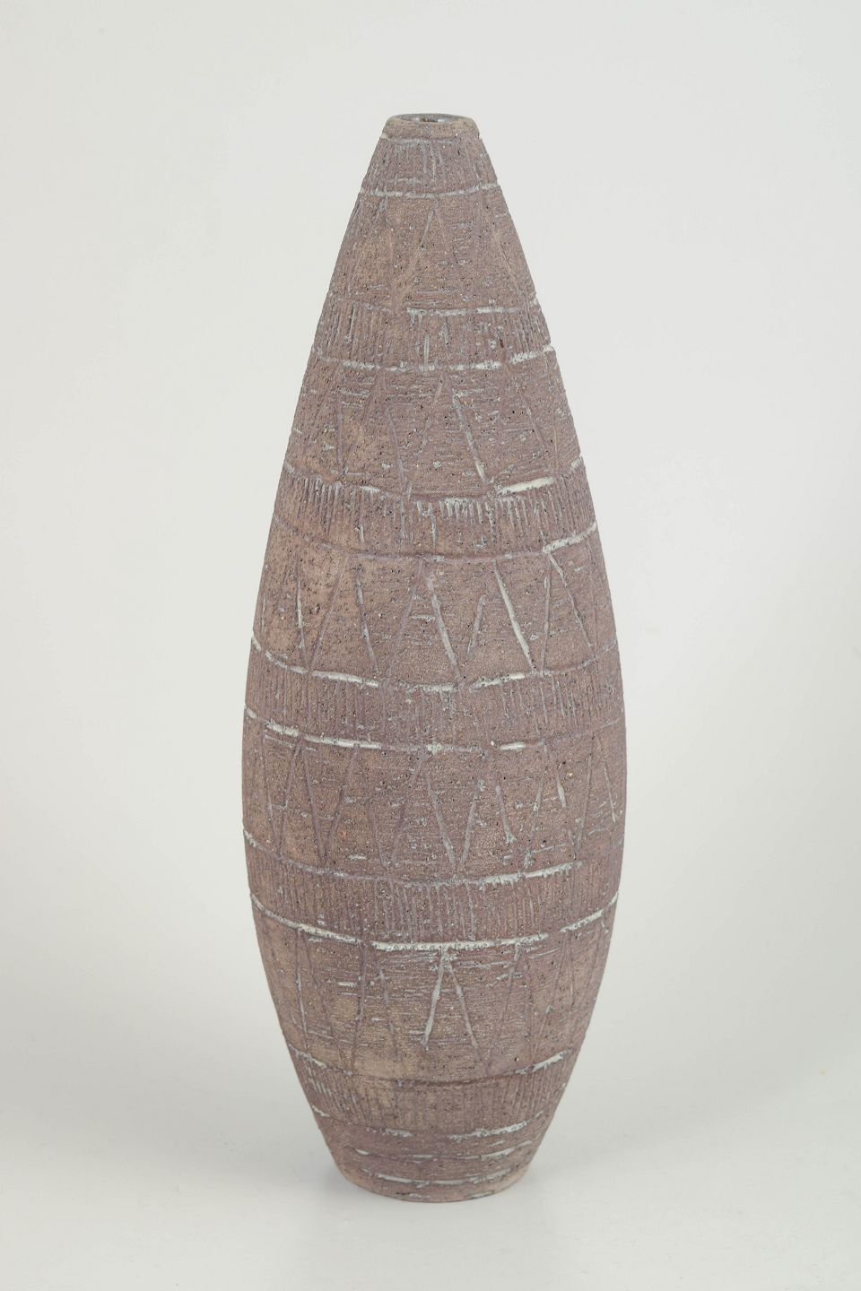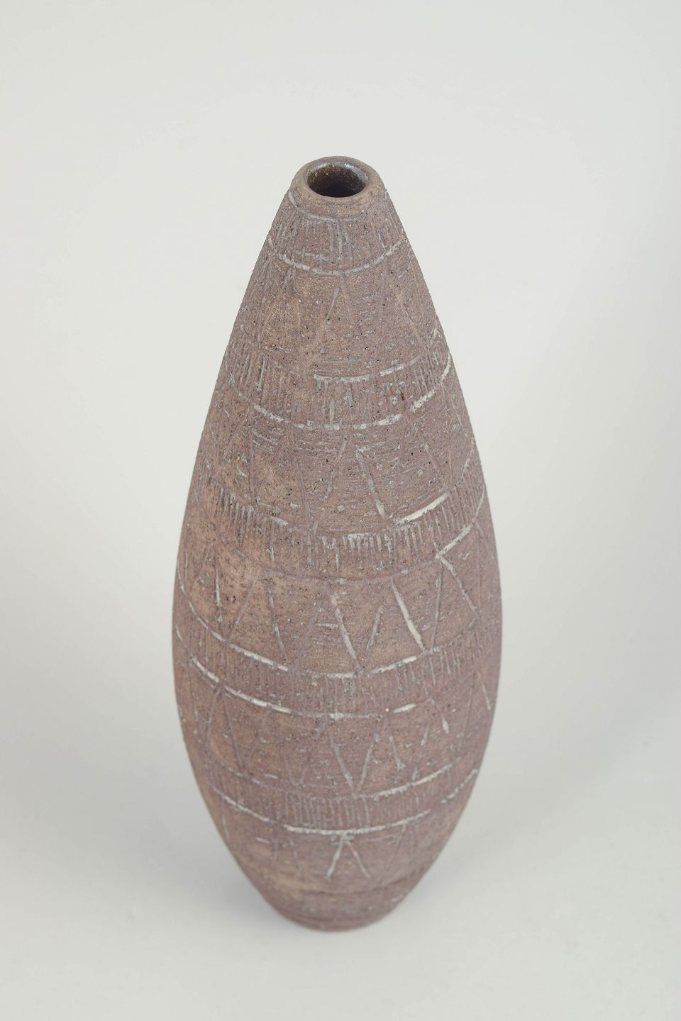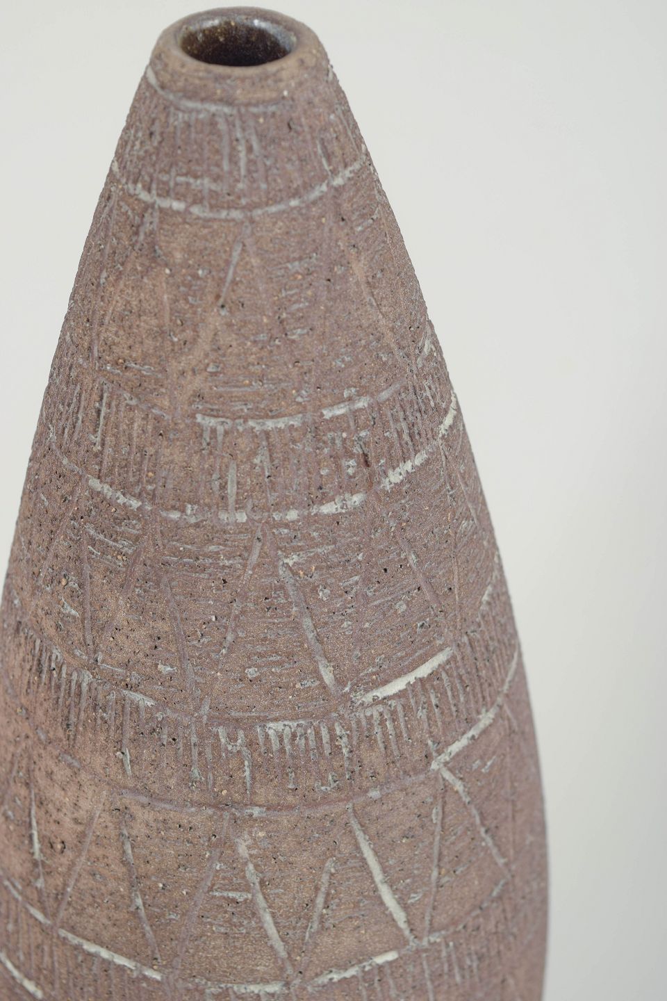 Elsi Bourelius, vase.Slender conical vase in thrown stoneware with a raw, matte surface and incised geometric decoration. The stamped mark to the base indicates model 310.