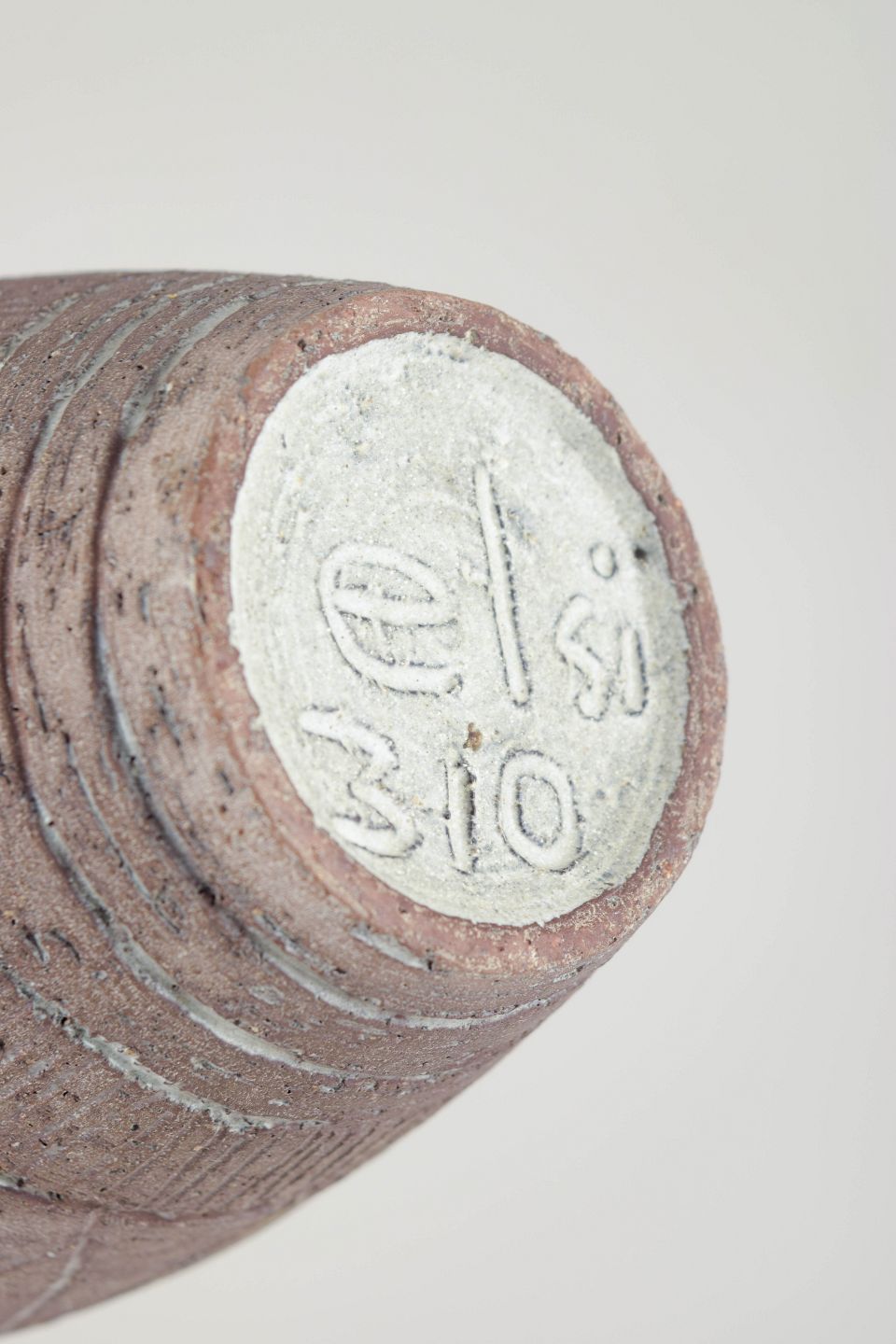 Elsi Bourelius was born on 8 April 1909 in Kalmar, Sweden, and died on 26 May 2001. She worked as an independent studio potter and is known for her slender, sculptural forms and the consistent use of incised decoration that emphasises the tactile qualities of the material. Her works were produced in limited quantities and are often stamped or signed to the base.