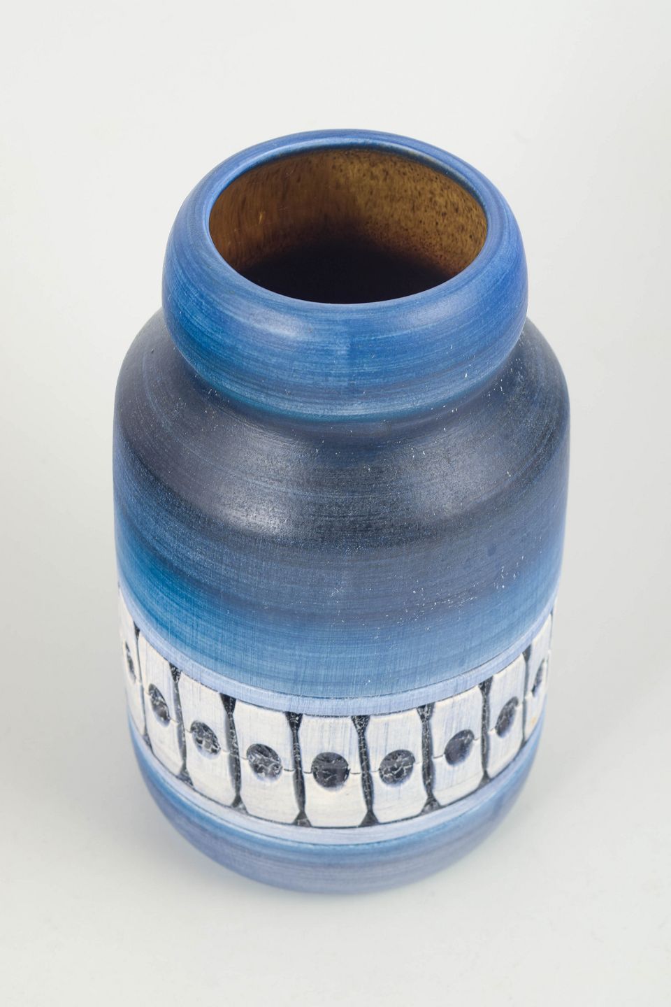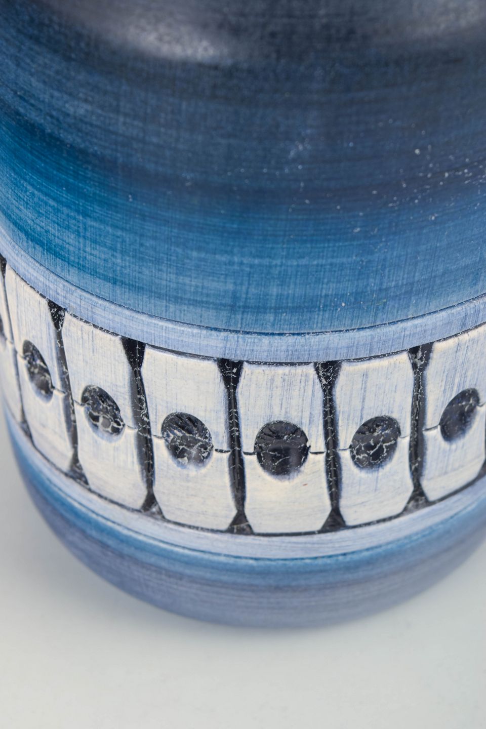 Beit Hayotser Ltd., vase.Cylindrical vase in thrown stoneware with a blue glaze ranging from deep cobalt to lighter blue tones, decorated with a graphic black-and-white band. Original sticker to the base.