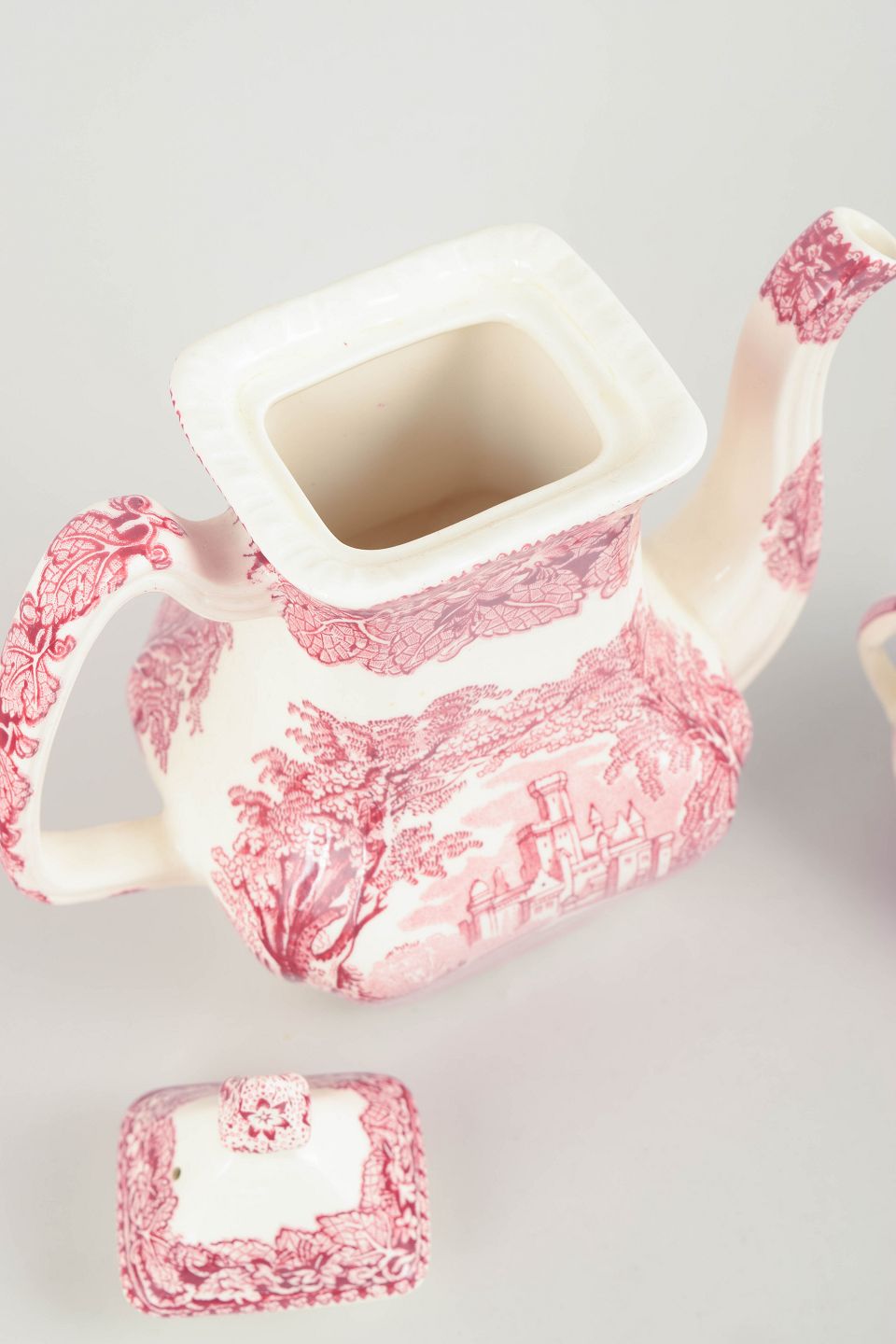 Set of coffee pot and sugar bowl, Mason’s and Palissy.Faience coffee pot and sugar bowl by Mason’s and Palissy, decorated in red transferware with landscape and architectural motifs.