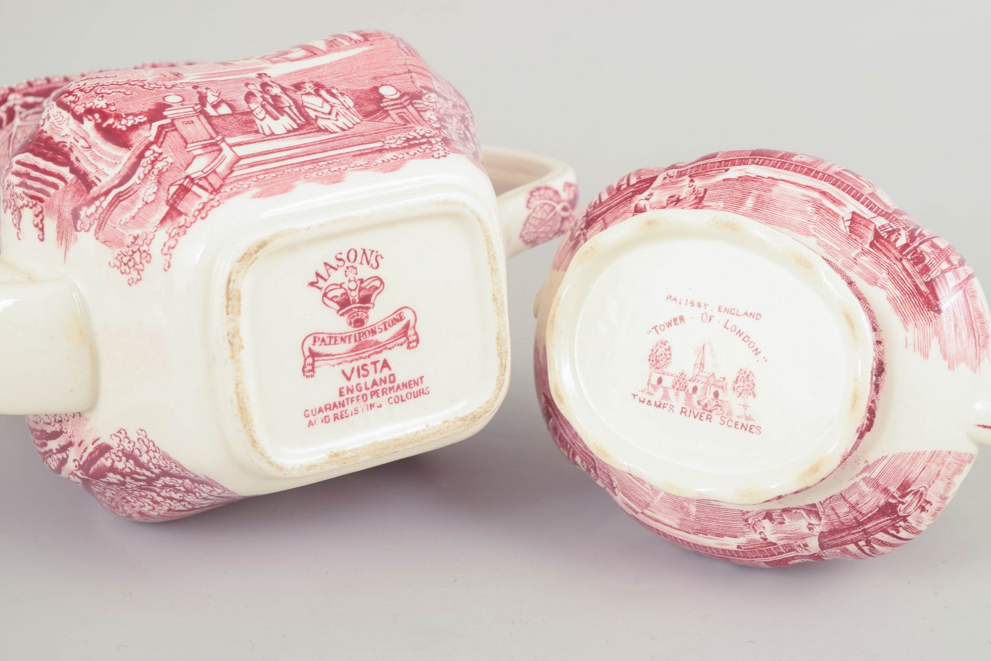 Mason’s traces back to the potter Charles James Mason (1791–1856), who founded the company in Staffordshire in the early 19th century and became known for ironstone production and later transferware-decorated faience. Palissy was active in the first half of the 20th century, producing decorative faience with English landscape and historical scenes. Together, they represent the strong English faience tradition of red transferware popular during the interwar period.