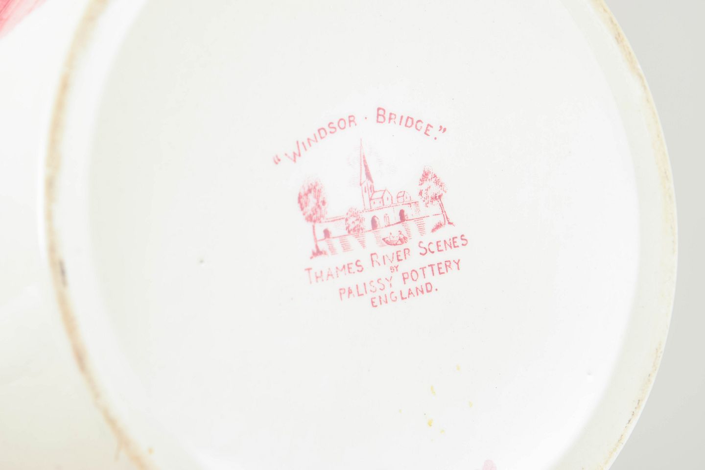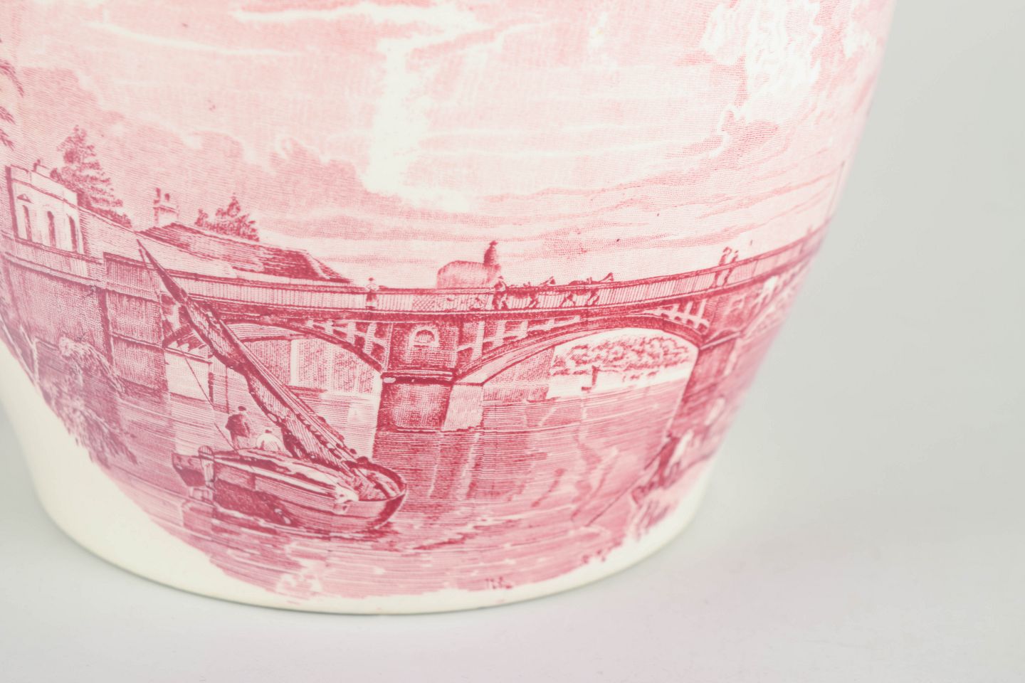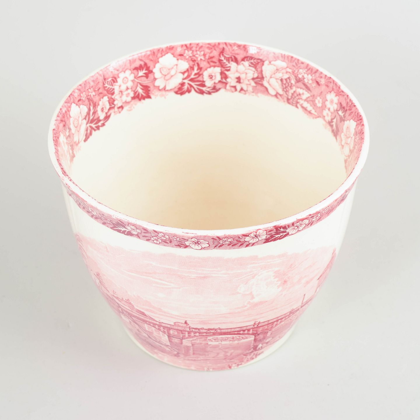 Palissy Pottery, flower pot holder.Faience flower pot holder by Palissy Pottery, decorated in red transferware with a Thames river scene and ornamental border.