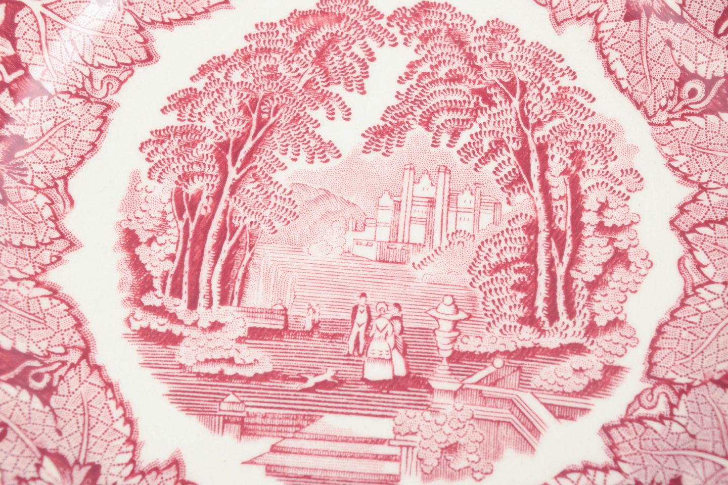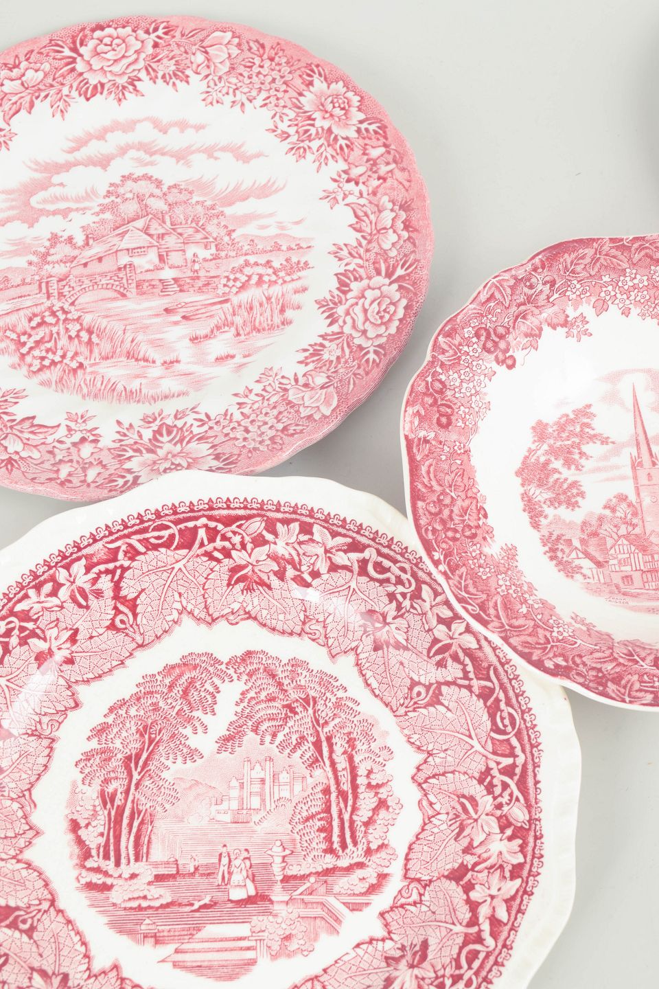 Set of plates and bowl, Mason’s and other English makers.Faience set comprising salad plates and a bowl, decorated in red transferware with landscape and ornamental motifs by various English manufacturers, including Mason’s.