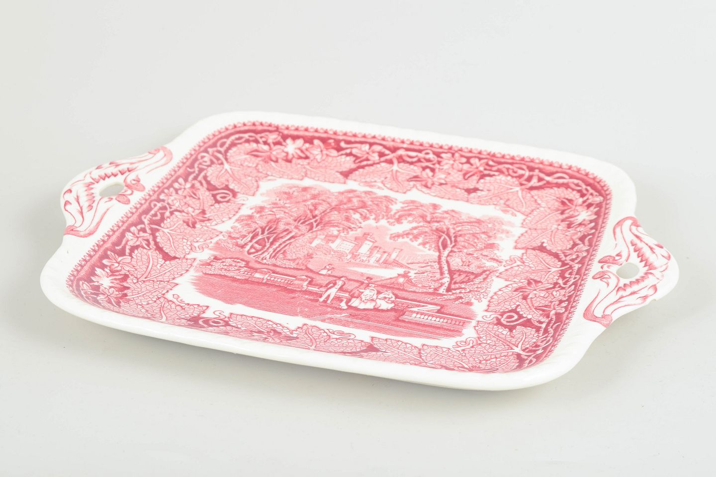 Mason’s, tray with handles.Rectangular faience tray by Mason’s, decorated in red transferware with a landscape scene and ornamental leaf border.