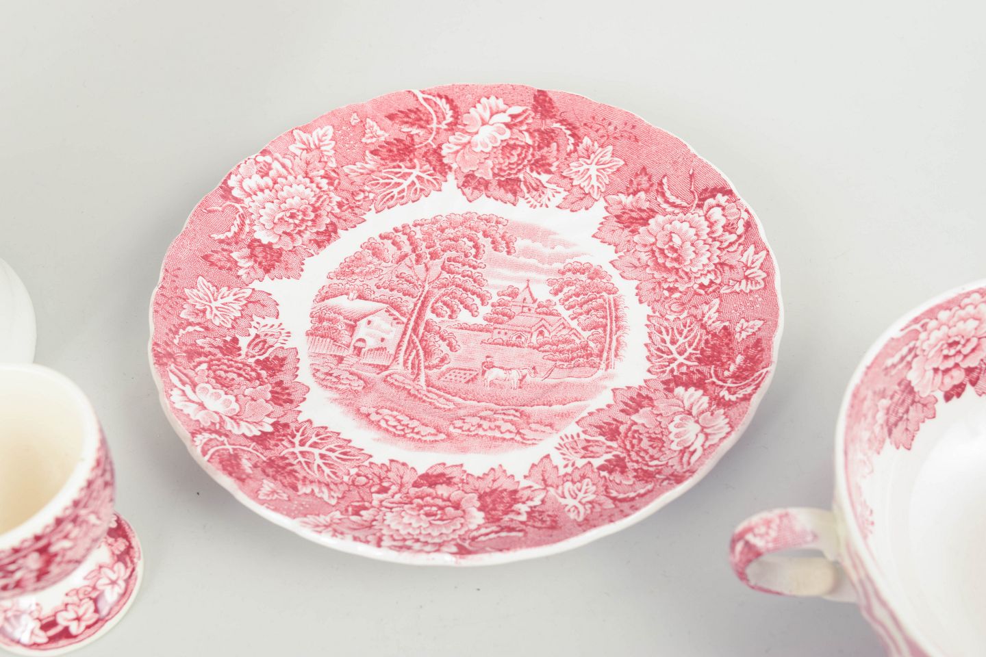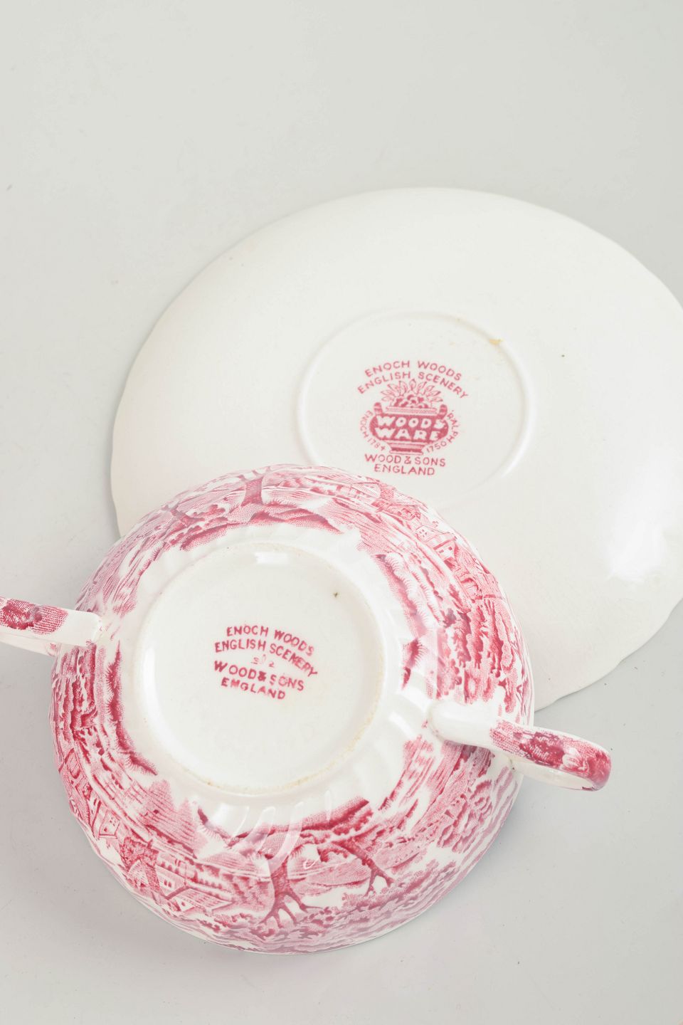 Mason’s, Wood & Sons, set of beer jug, bouillon cup with saucer and egg cup.Faience set by Mason’s / Wood & Sons, decorated in red transferware with landscape and ornamental motifs.