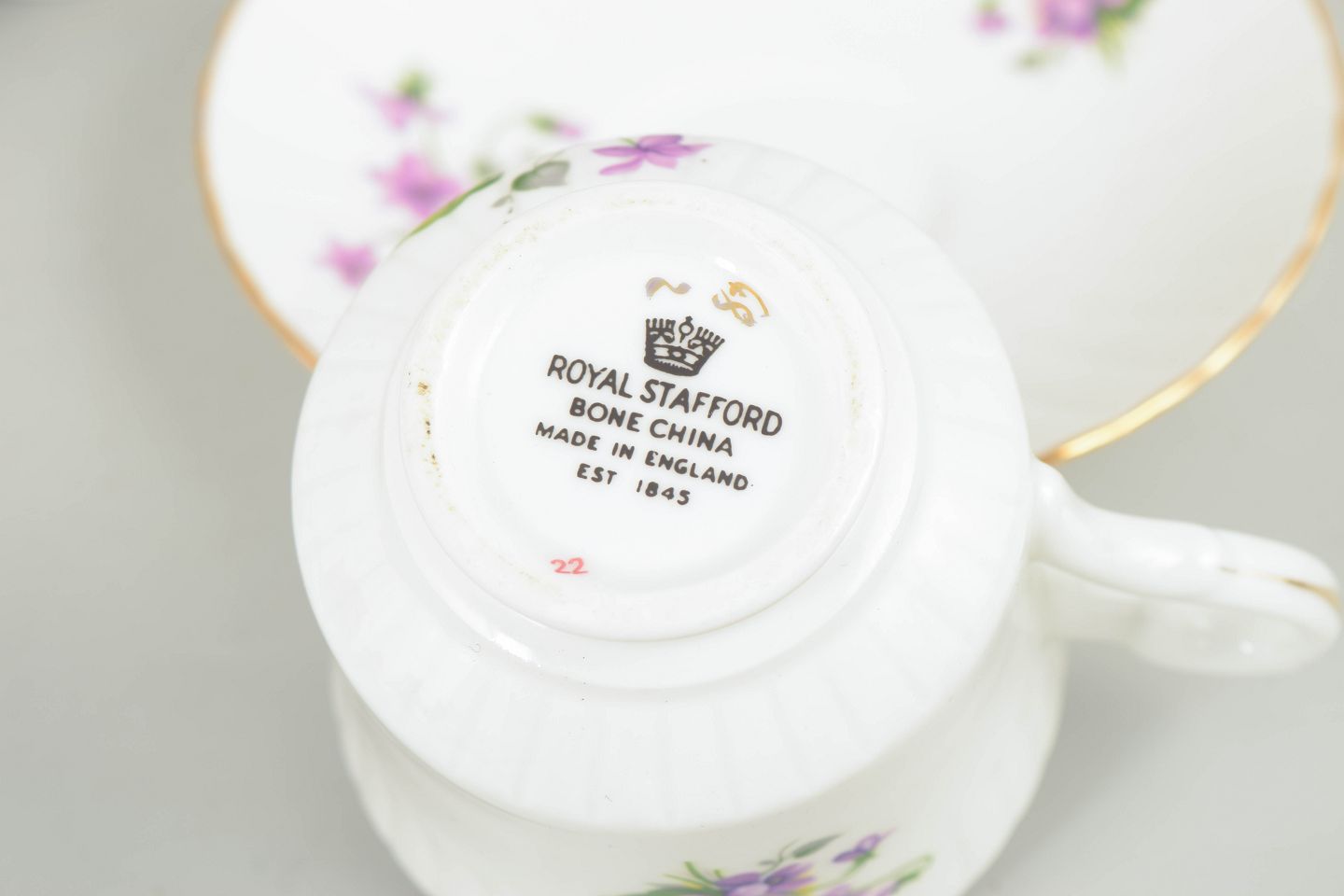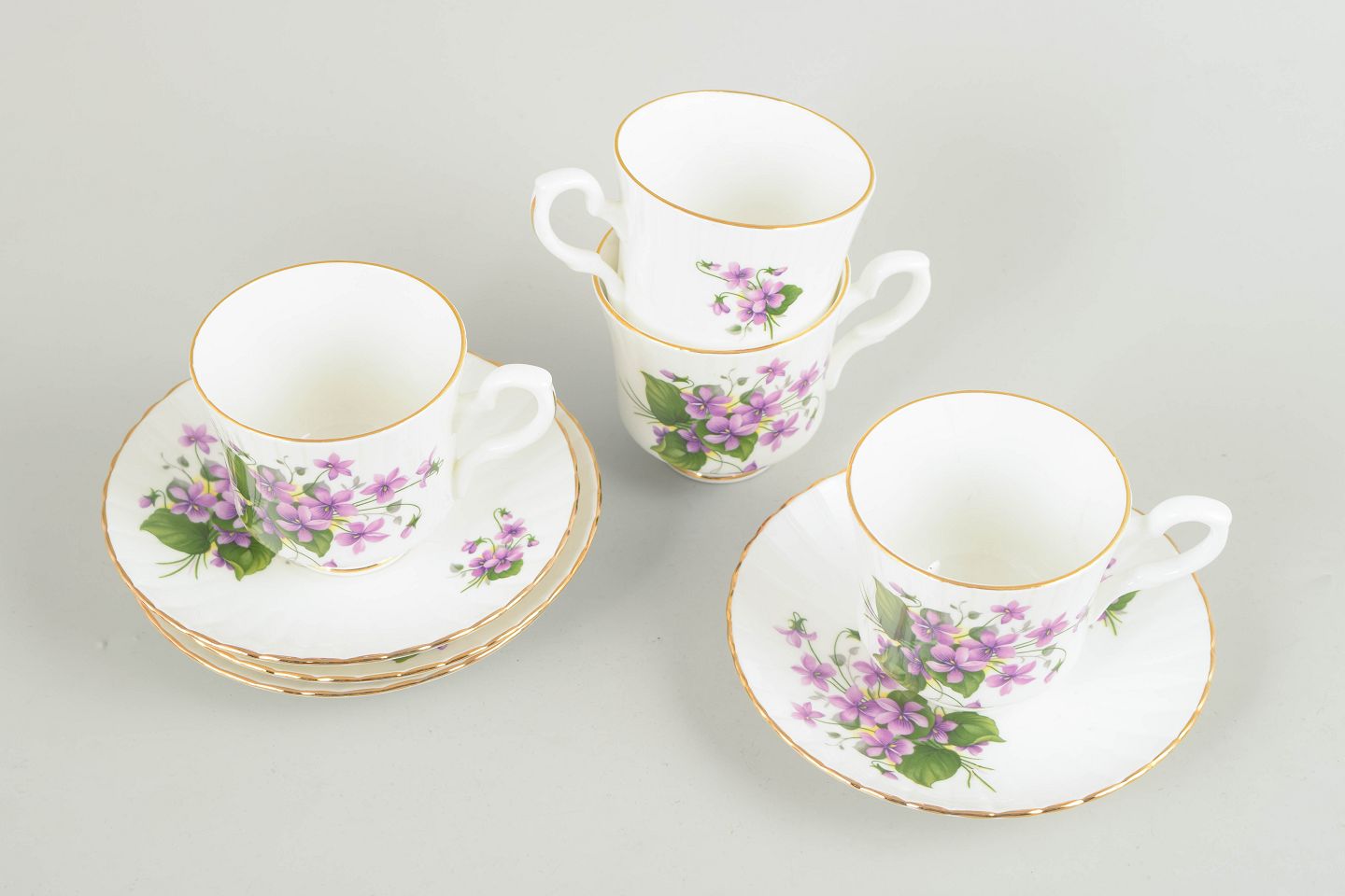 Royal Stafford, set of 4 coffee cups with saucers.Set of four coffee cups with matching saucers in bone china, decorated with purple flowers, green foliage and gilt rims. Produced by Royal Stafford, England.