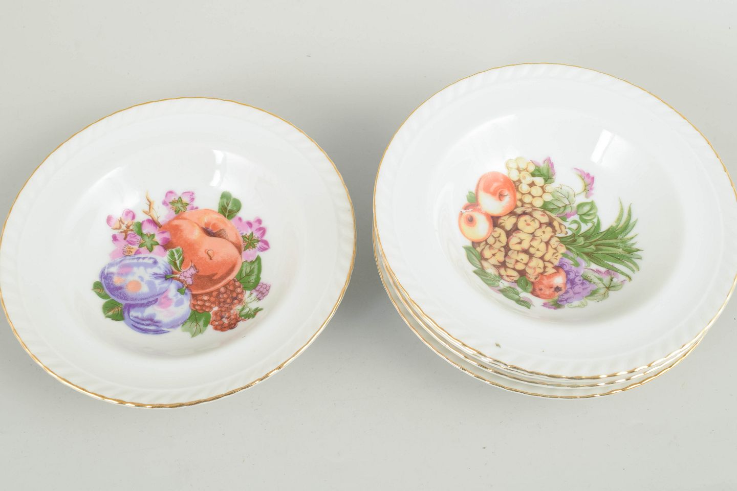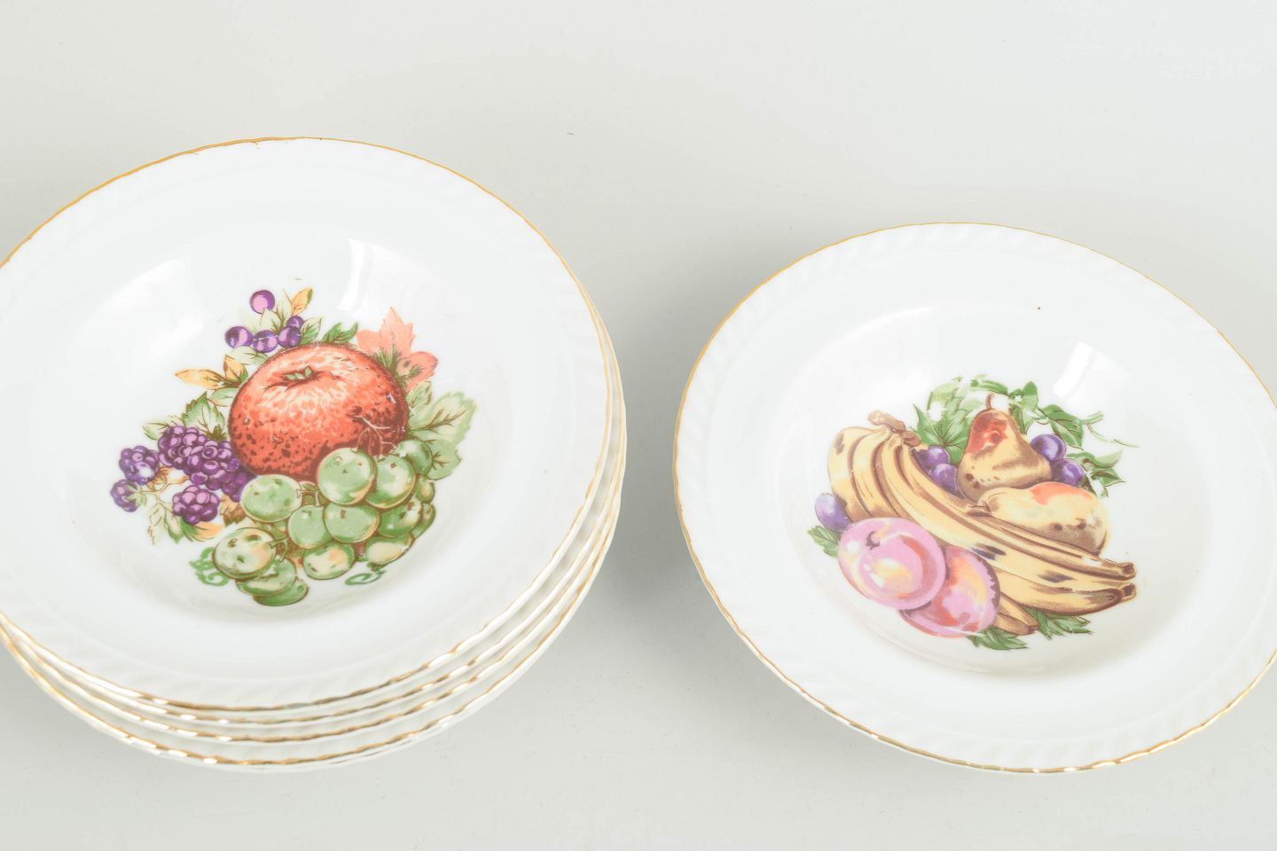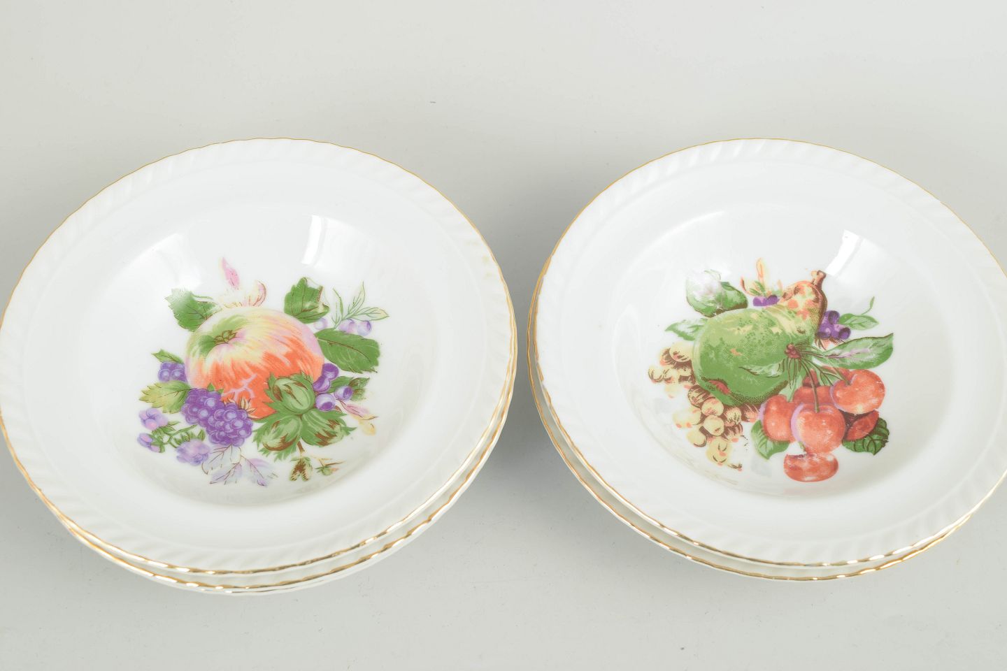 European porcelain maker, set of 6 bowls.Set of six porcelain bowls decorated with a polychrome fruit motif and a gilt rim. Classic European tableware in a characteristic interwar style. Marked to the base.