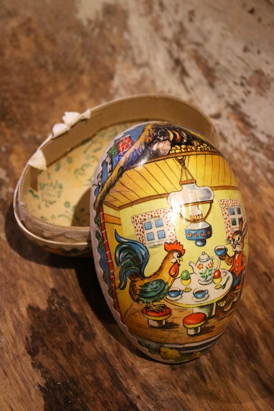 Old vintage Easter egg in papier-mâché with a motif of an Easter bunny and a chicken drinking tea together. Height: 12cm.Item number: Påskeæg nr.2