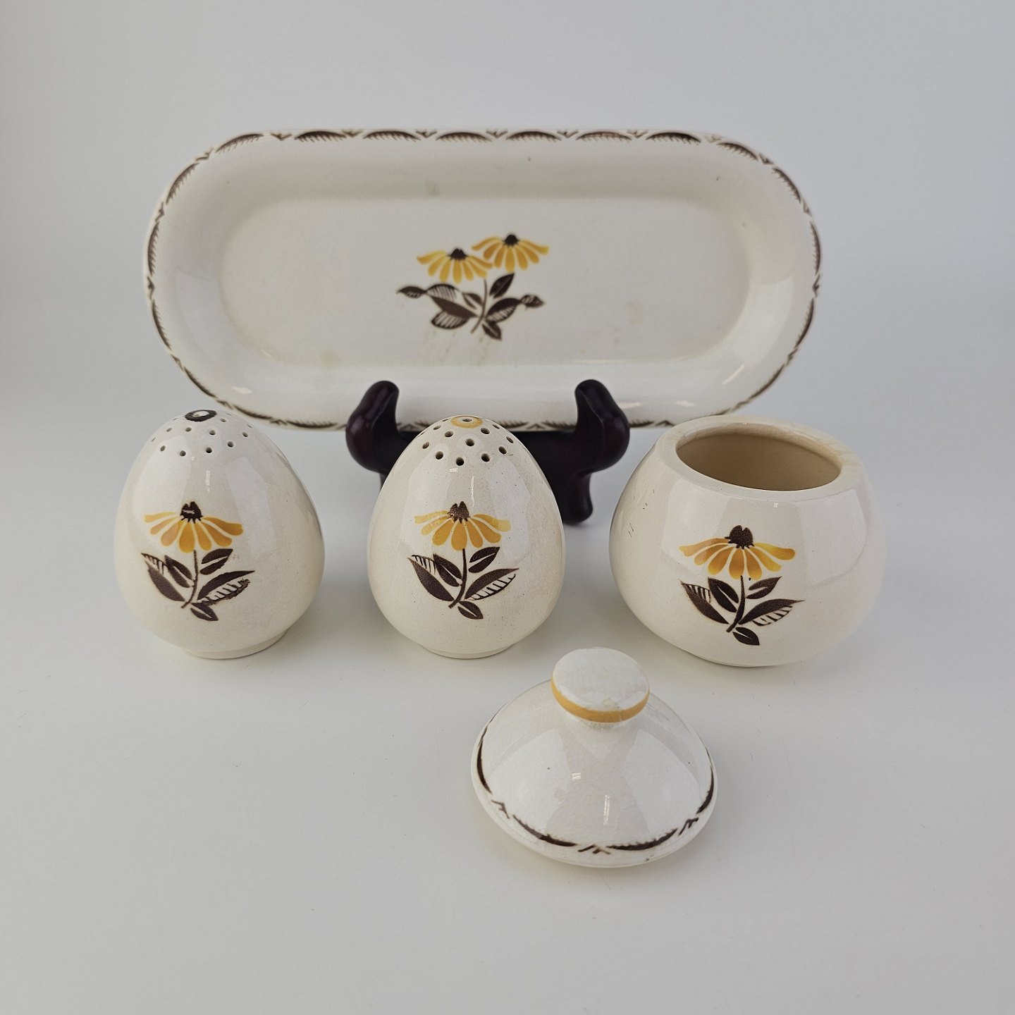 Trekantet fad med sennepskrukke, saltbøsse og peberbøsse i fajance fra stellet Birthe