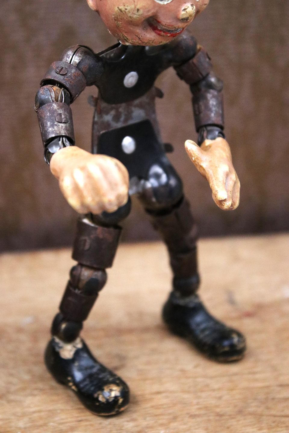Funny, old figure in metal and plaster of a little man. Body, arms and legs are in metal that can be bent, head and hands are in painted plaster(has a little chipping). Height: 16.5cm.