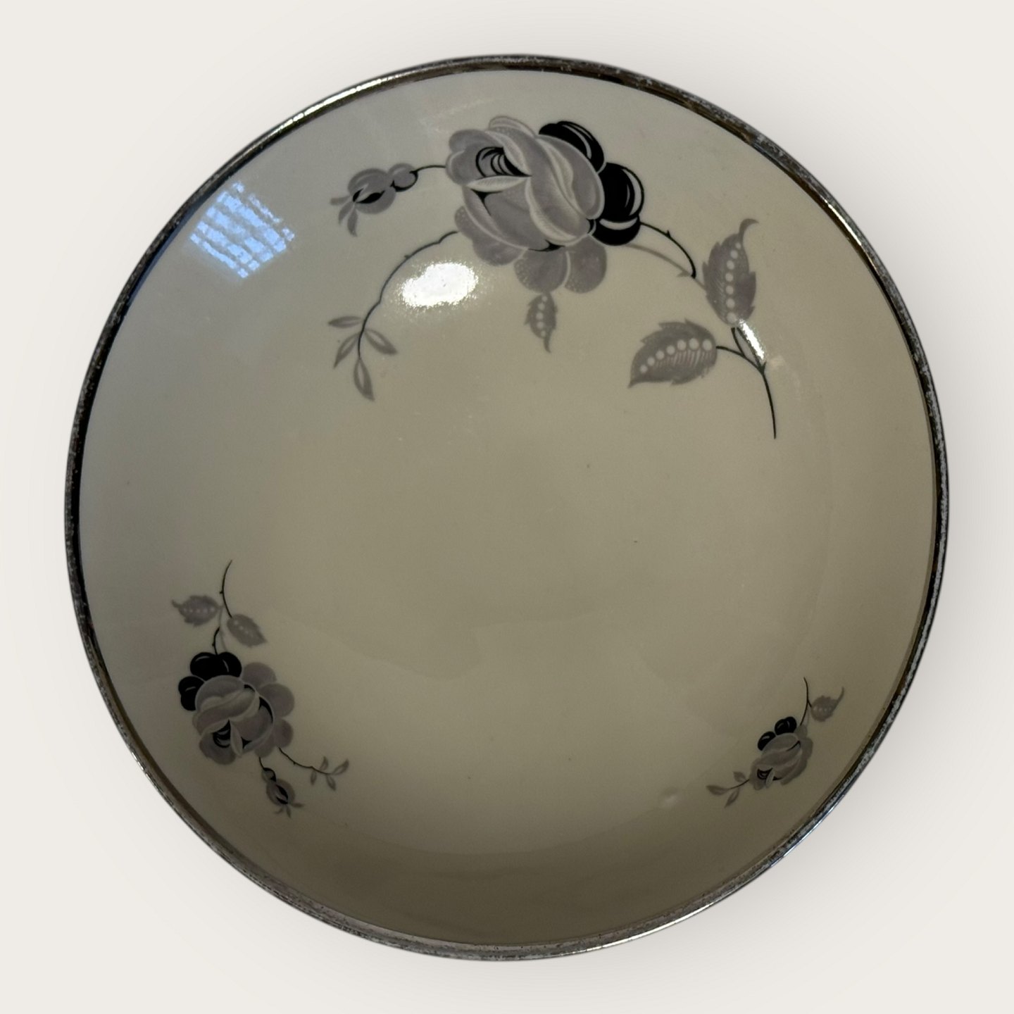 Black rose, with Plantin edge, KPM, Lyngby, Bowl on foot, 19cm in diameter, height 6.5cm *slight wear on the silver edge, otherwise in good condition*