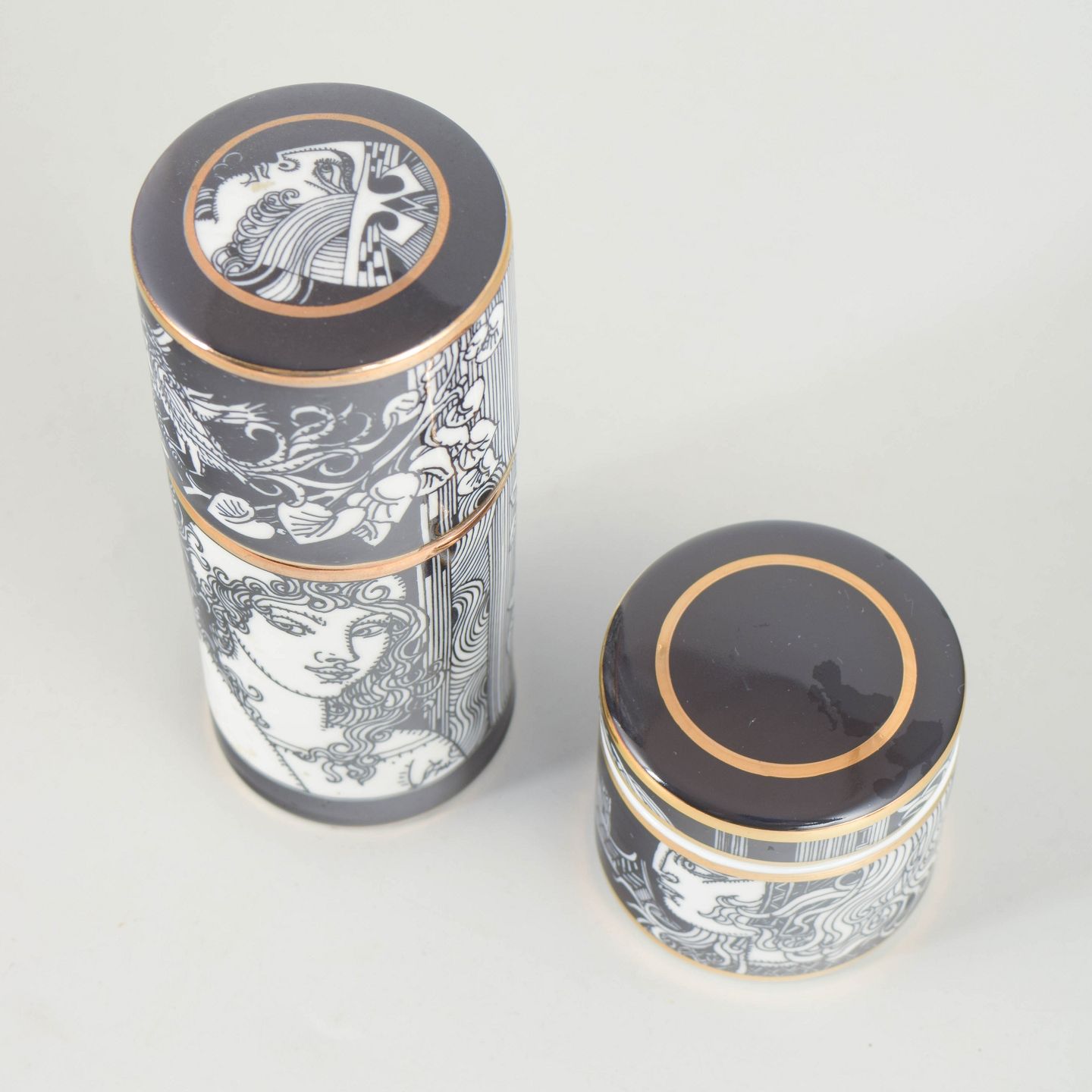 Hollóháza Porcelain Manufactory, 2 lidded jars.Two cylindrical porcelain lidded jars with black and white graphic decoration and gilt details. Produced as a limited edition.