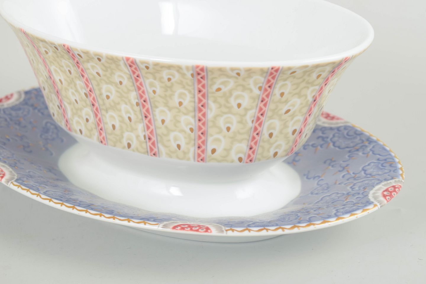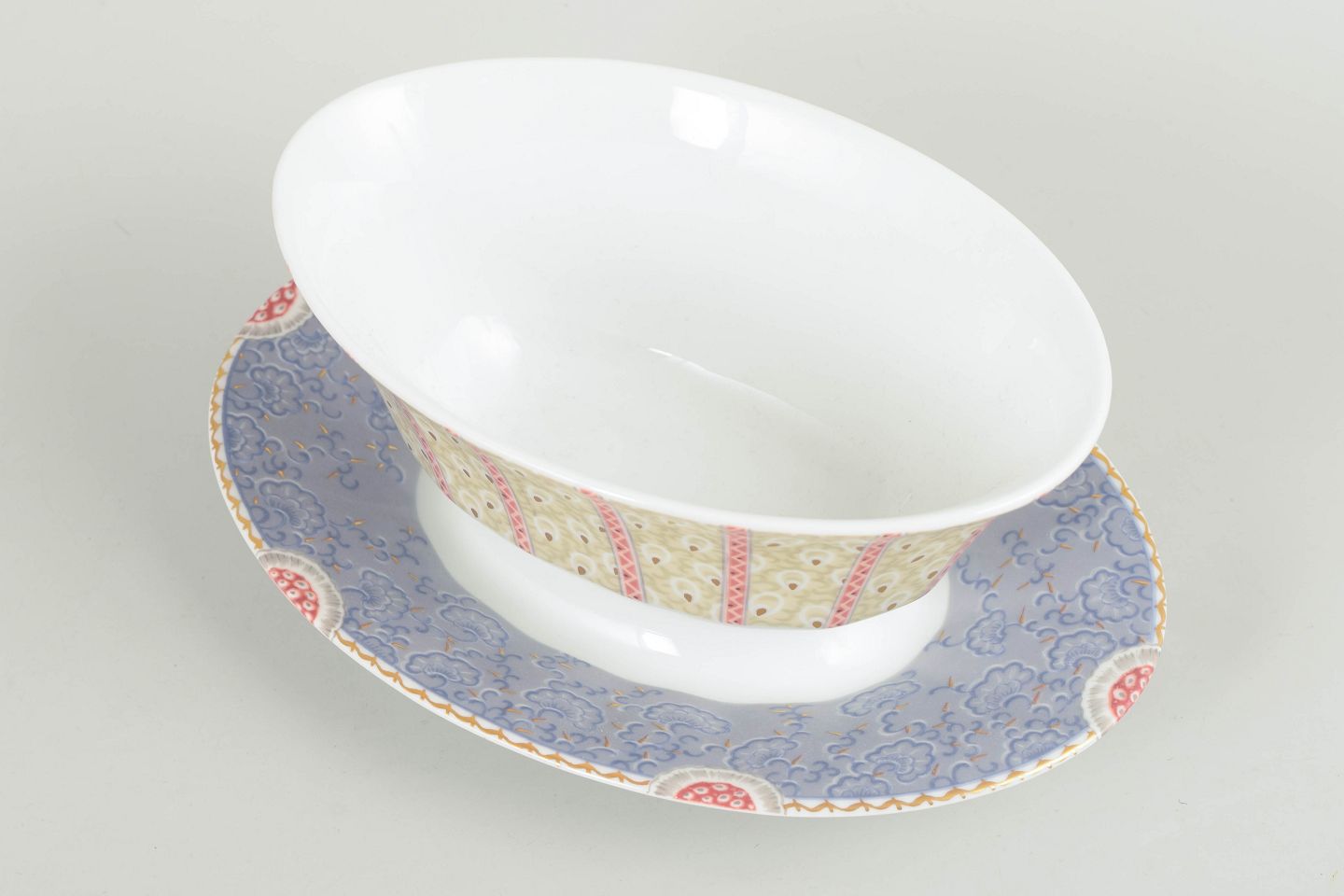 Elegant sauce boat in white porcelain decorated with the Fairytale pattern in soft pastel colours and delicate detailing. This model was produced between 1992 and 1999 and is of first factory quality.
