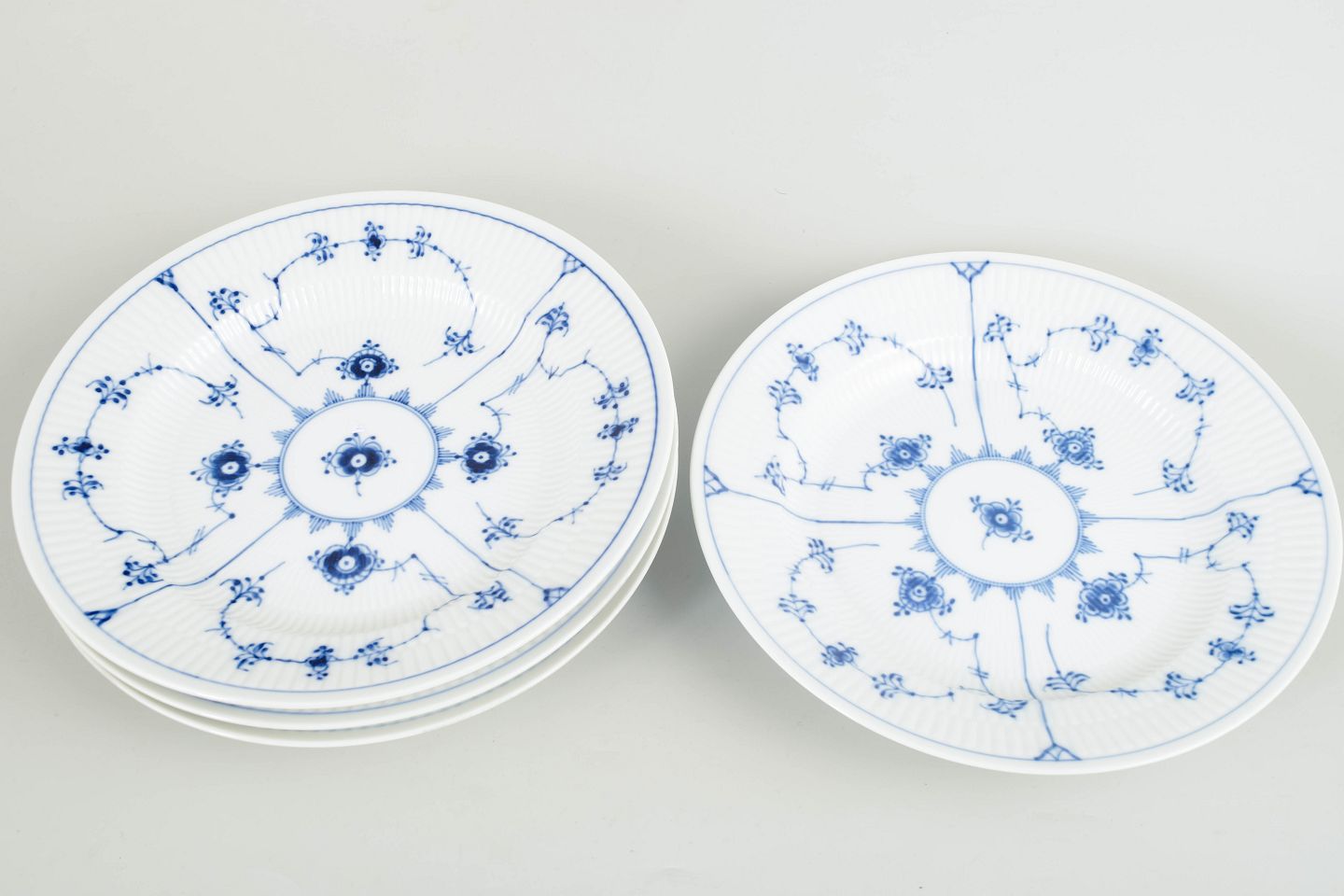Royal Copenhagen, Blue Fluted Plain, set of 4 dinner plates.Set of 4 dinner plates in white porcelain decorated with hand-painted cobalt blue Blue Fluted Plain pattern. Model 1/575.