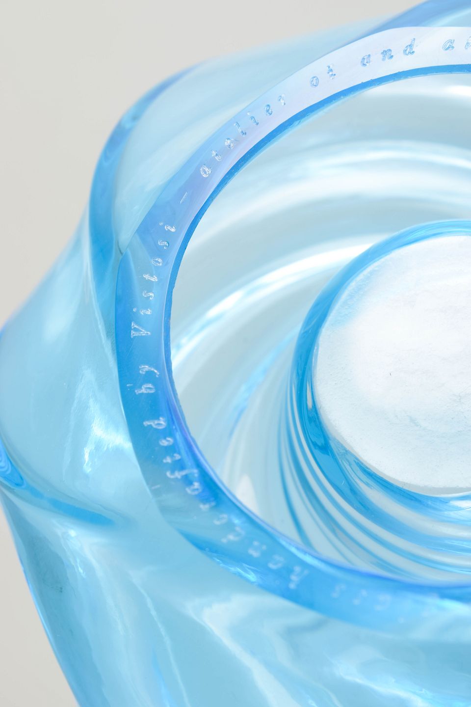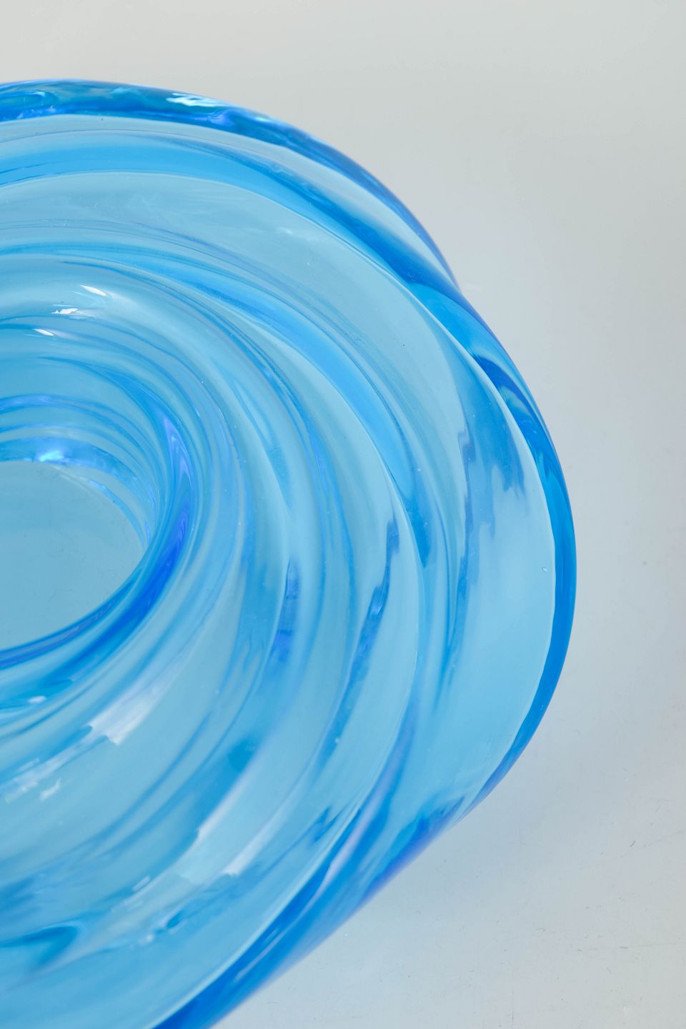 Vistosi atelier, Murano art glass bowl.Sculptural bowl in clear blue mouth-blown glass with a dynamic spiral form and flowing contours.