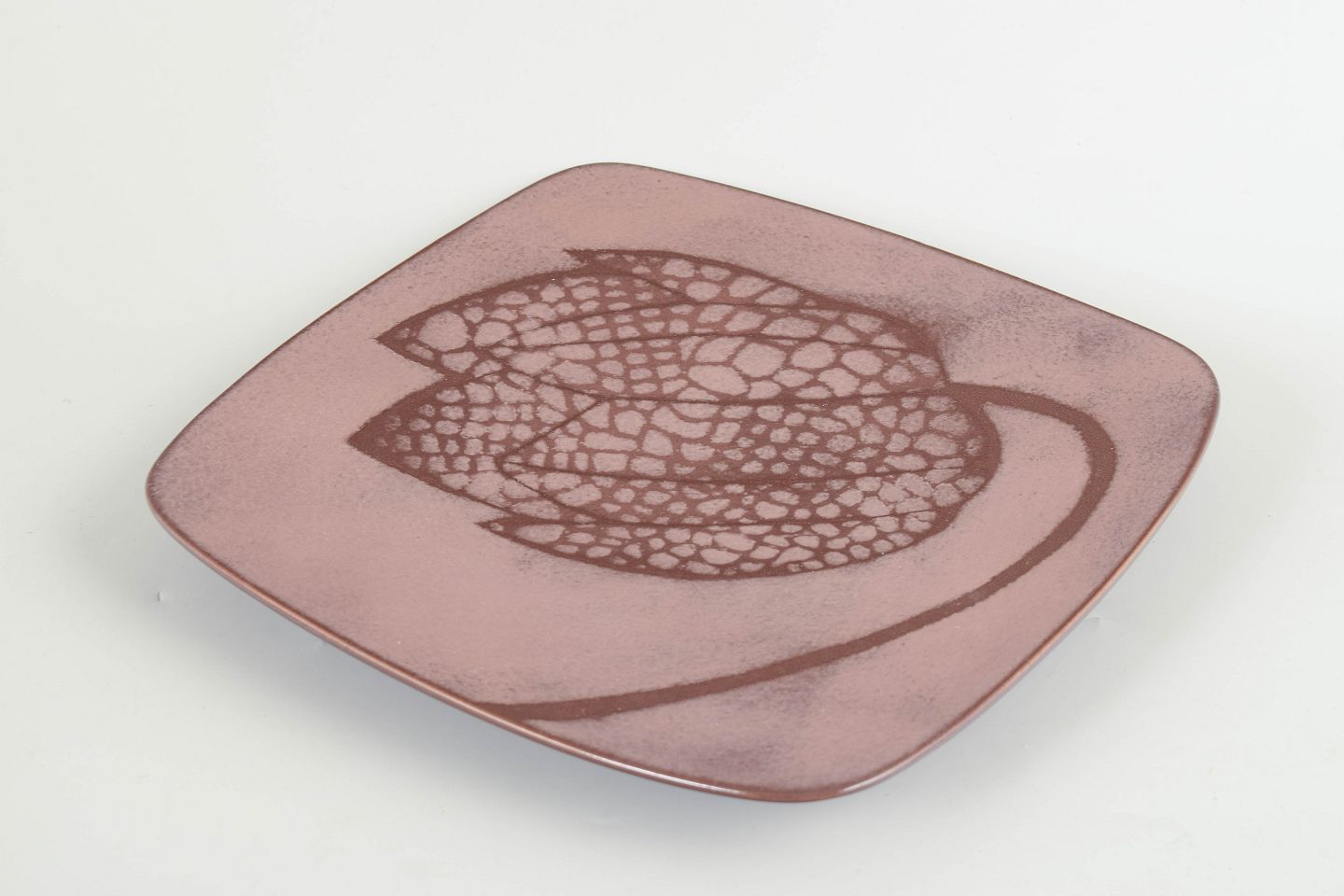 Ann Pentik for Pentik Studio, unique dish.Square stoneware dish with a subdued pink glaze and a stylised leaf motif in darker tones. Signed Ann Pentik on the base. Unique work from Pentik Studio.