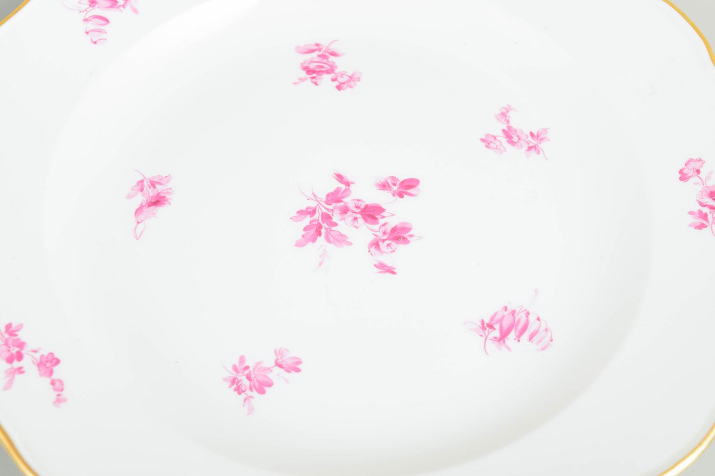 Meissen, set of 4 dinner plates.Porcelain dinner plates with softly scalloped rims, gilt edges and hand-painted decoration in pink floral motifs. A classic Meissen design from around 1900.