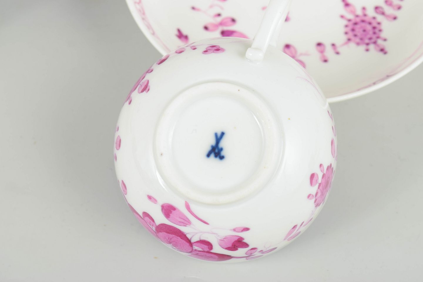 Antique small porcelain coffee cups with hand-painted decoration in pink tones. Classic Meissen aesthetic with delicate floral and band motifs.